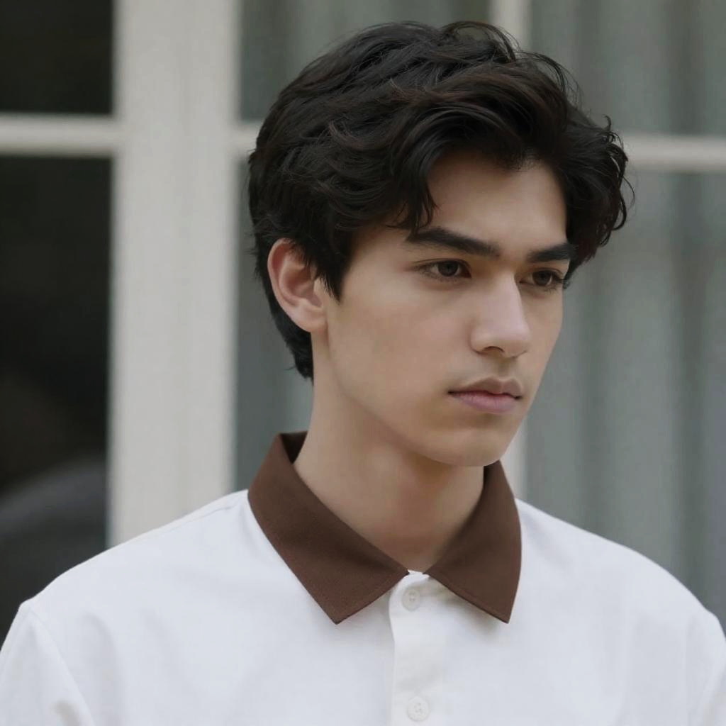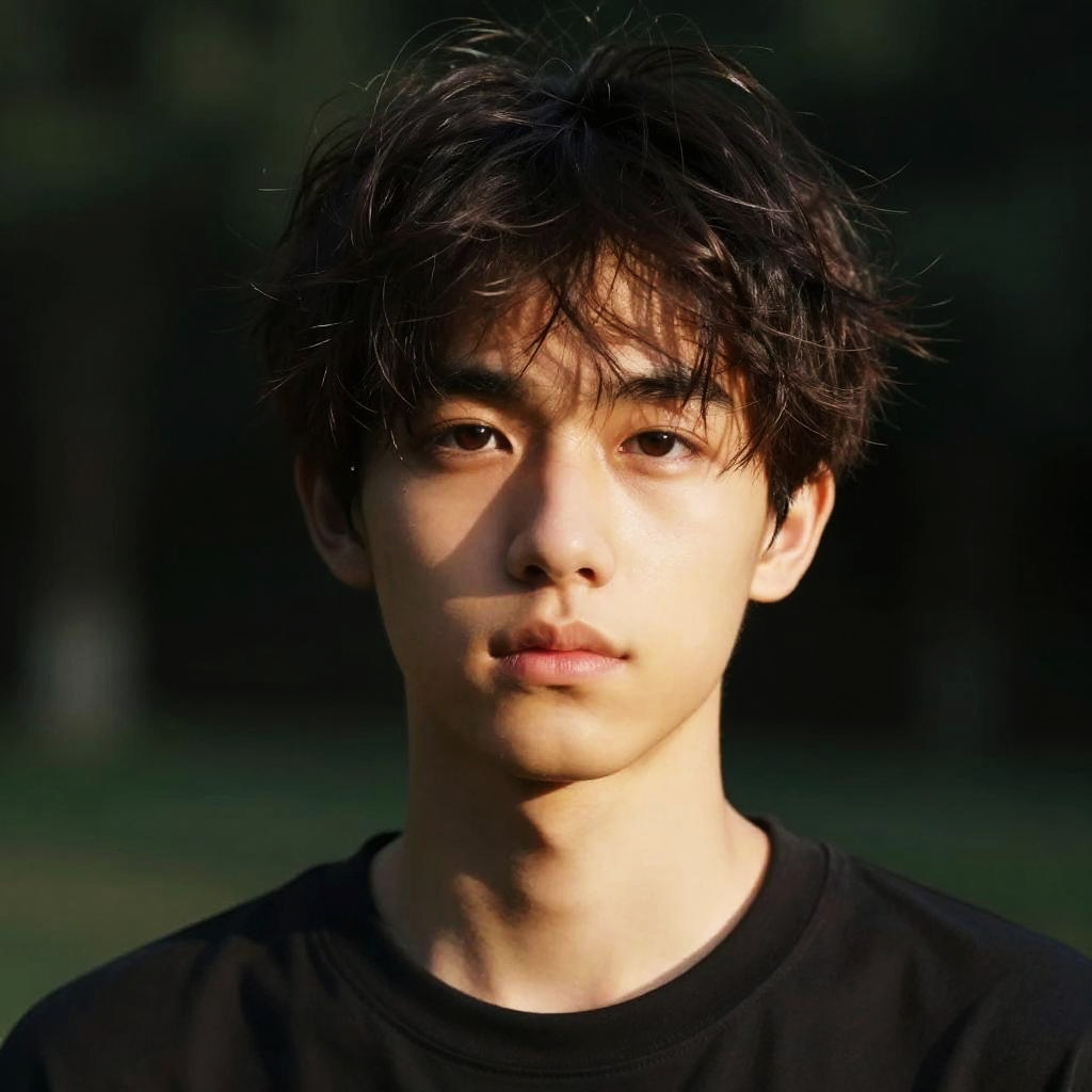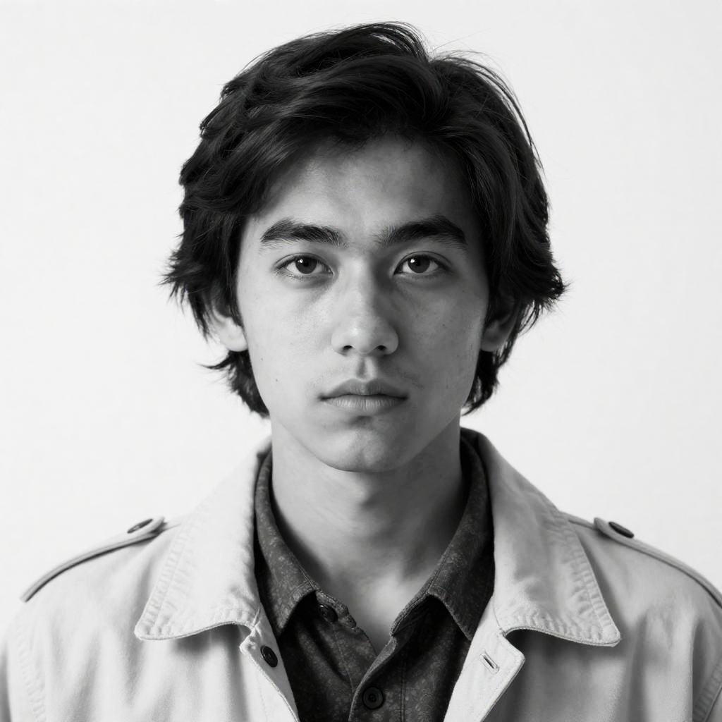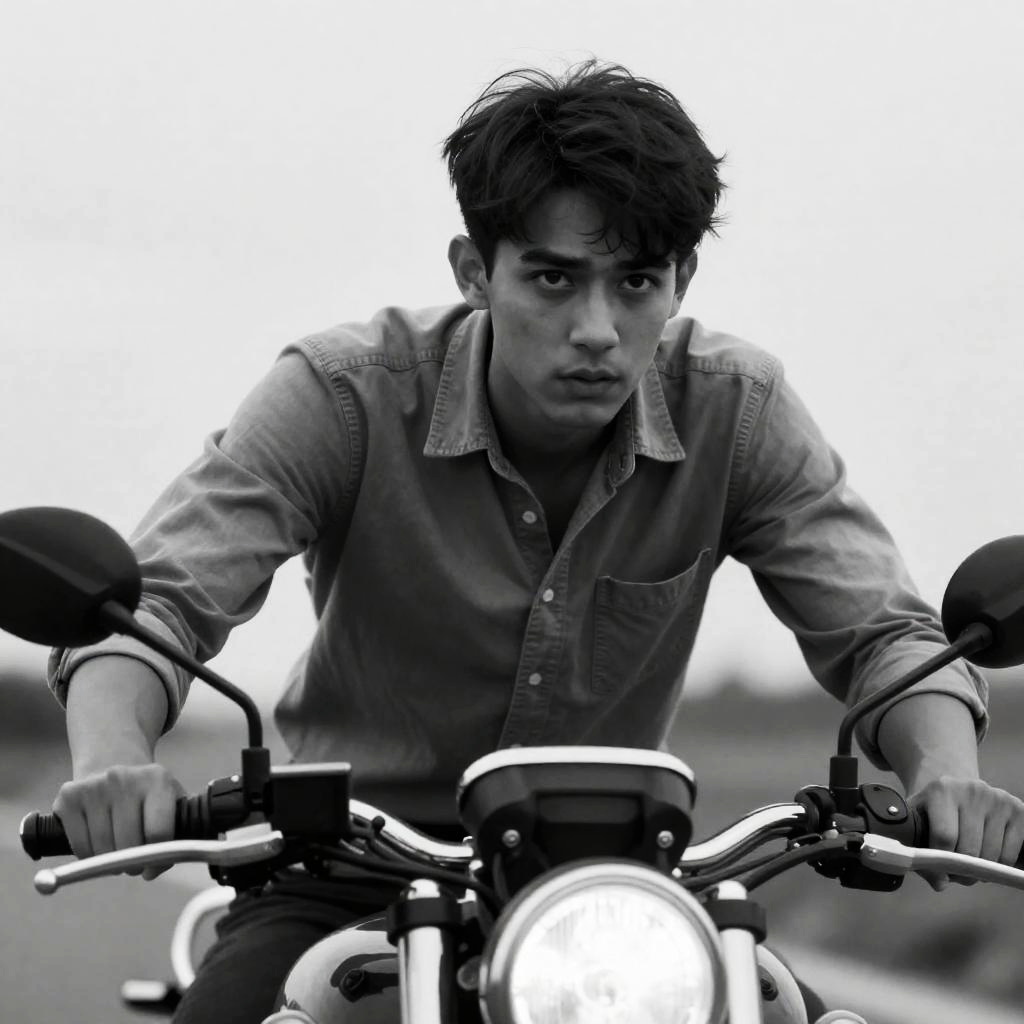 Black and white photograph of a young man with short, slightly messy hair, intense expression, leaning forward on a motorcycle. He wears a button-up shirt, gripping the handlebars, with a headlight in front.