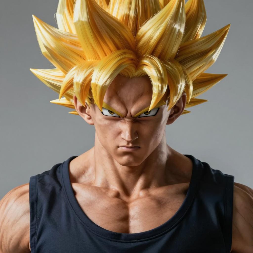 Close-up portrait of a muscular man with intense expression, styled with bright yellow, spiked hair resembling a Super Saiyan from Dragon Ball. The subject wears a dark sleeveless tank top, highlighting well-defined chest and shoulder muscles. The dramatic lighting emphasizes the strong facial features and dynamic hair styling.