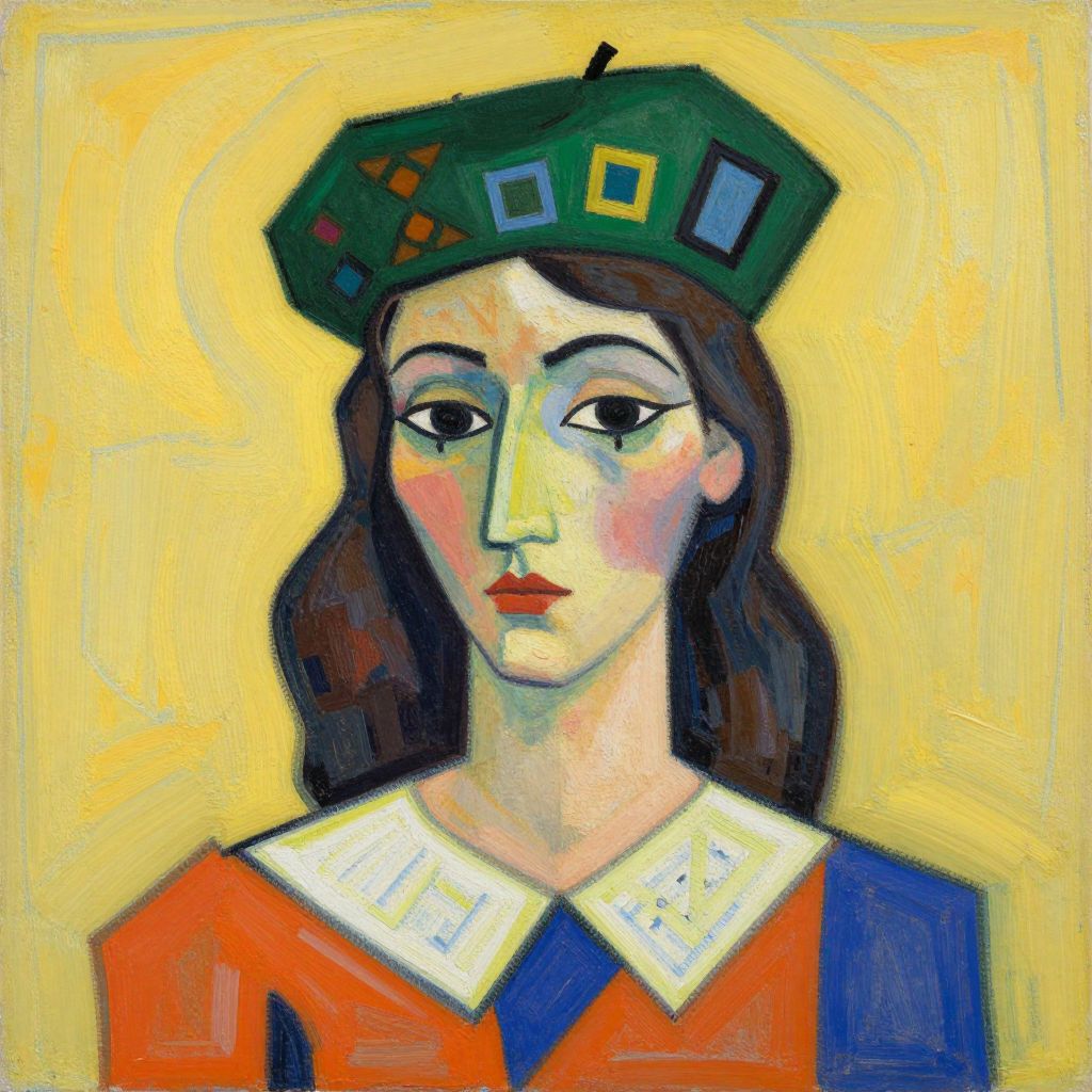 A vibrant cubist-style illustration by Pablo Picasso, featuring a woman with a stylized face, wearing a green beret adorned with geometric patterns and a matching collar, set against a warm yellow background with soft blue contours, showcasing the artist's iconic use of bold colors and abstract forms.