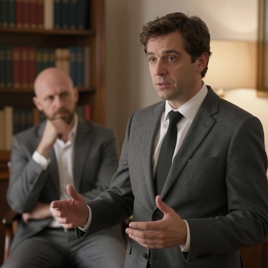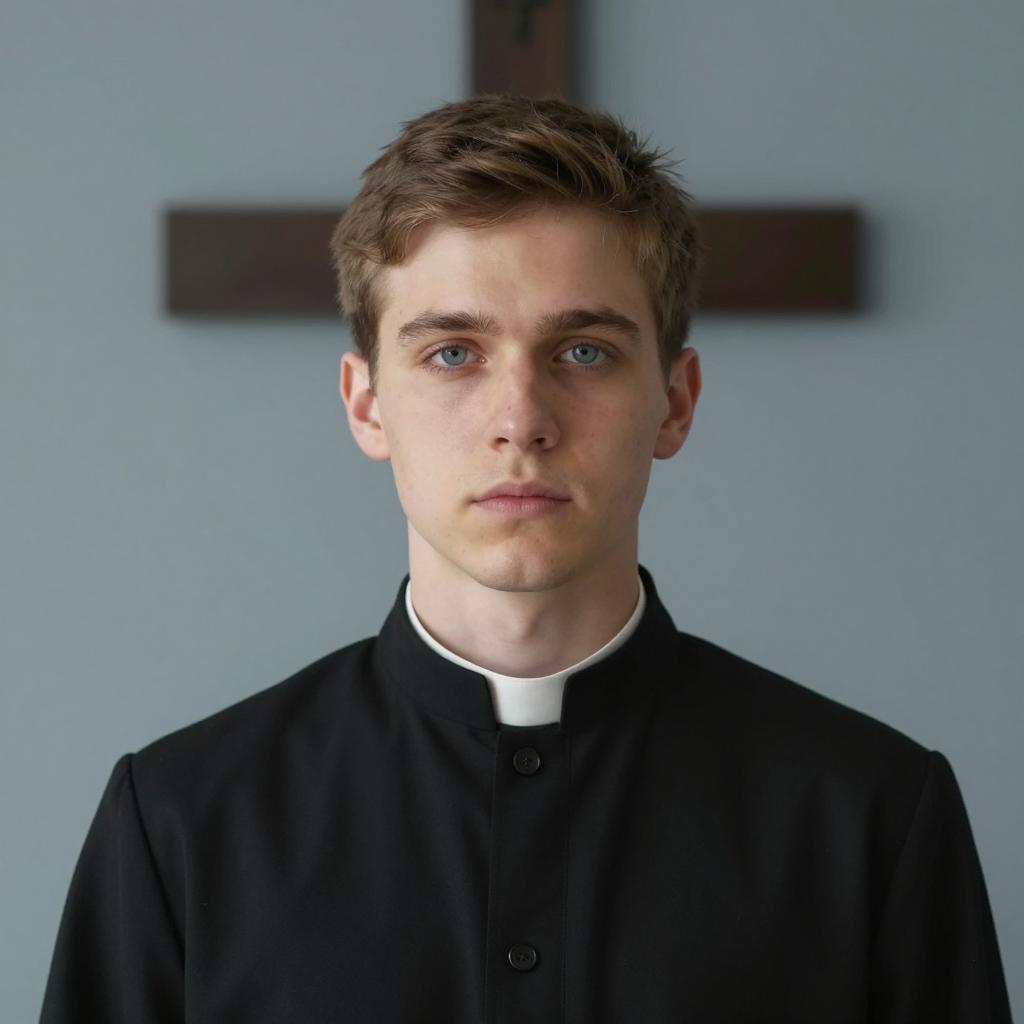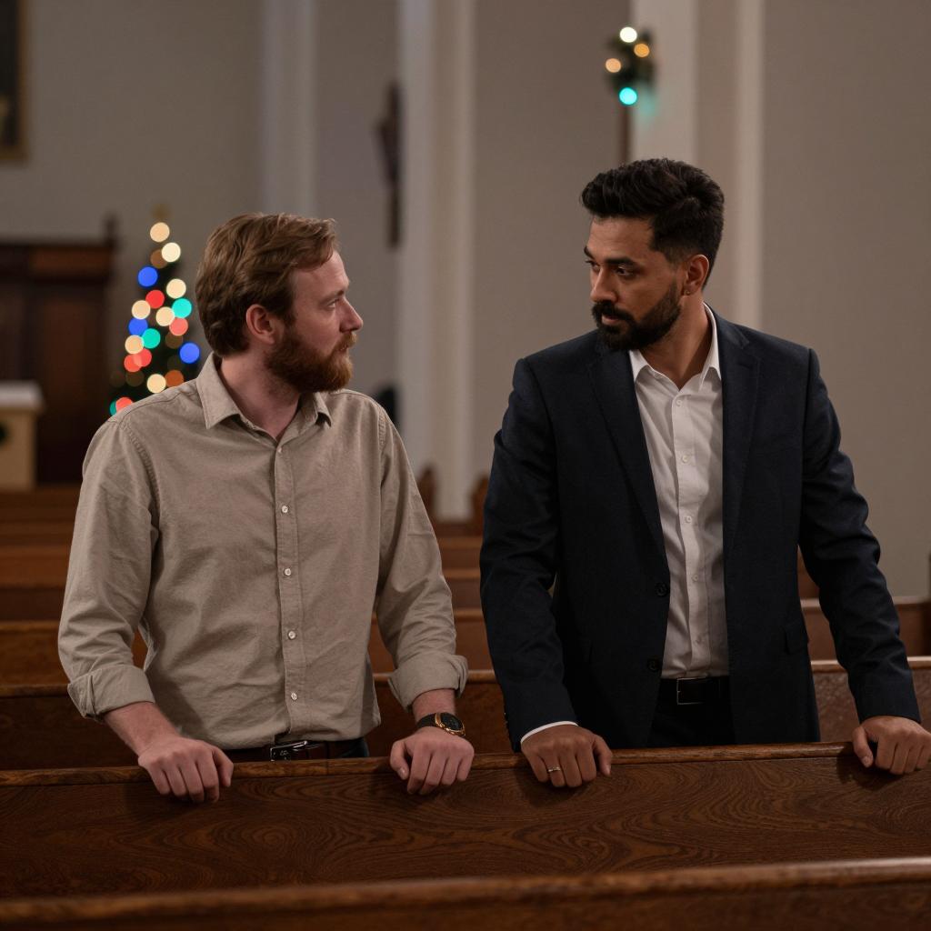 Bearded man with gray hair, dark suit, and tie sits in church pew, looking slightly to the left. Young boy with light brown hair, red scarf, and brown jacket sits beside him, looking downward. Church interior with wooden pews, blurred background, arches, and soft lighting. Two elderly people in background. Misty atmosphere.