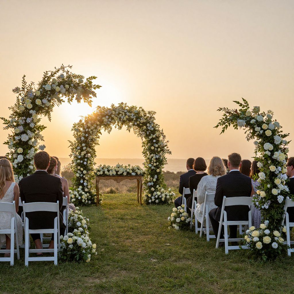 Wedding ceremony generator creating a magical outdoor scene with floral archways, rows of white chairs, a golden sunset backdrop, elegantly dressed guests, and a delicate altar adorned with roses and greenery, capturing the essence of a romantic union.
