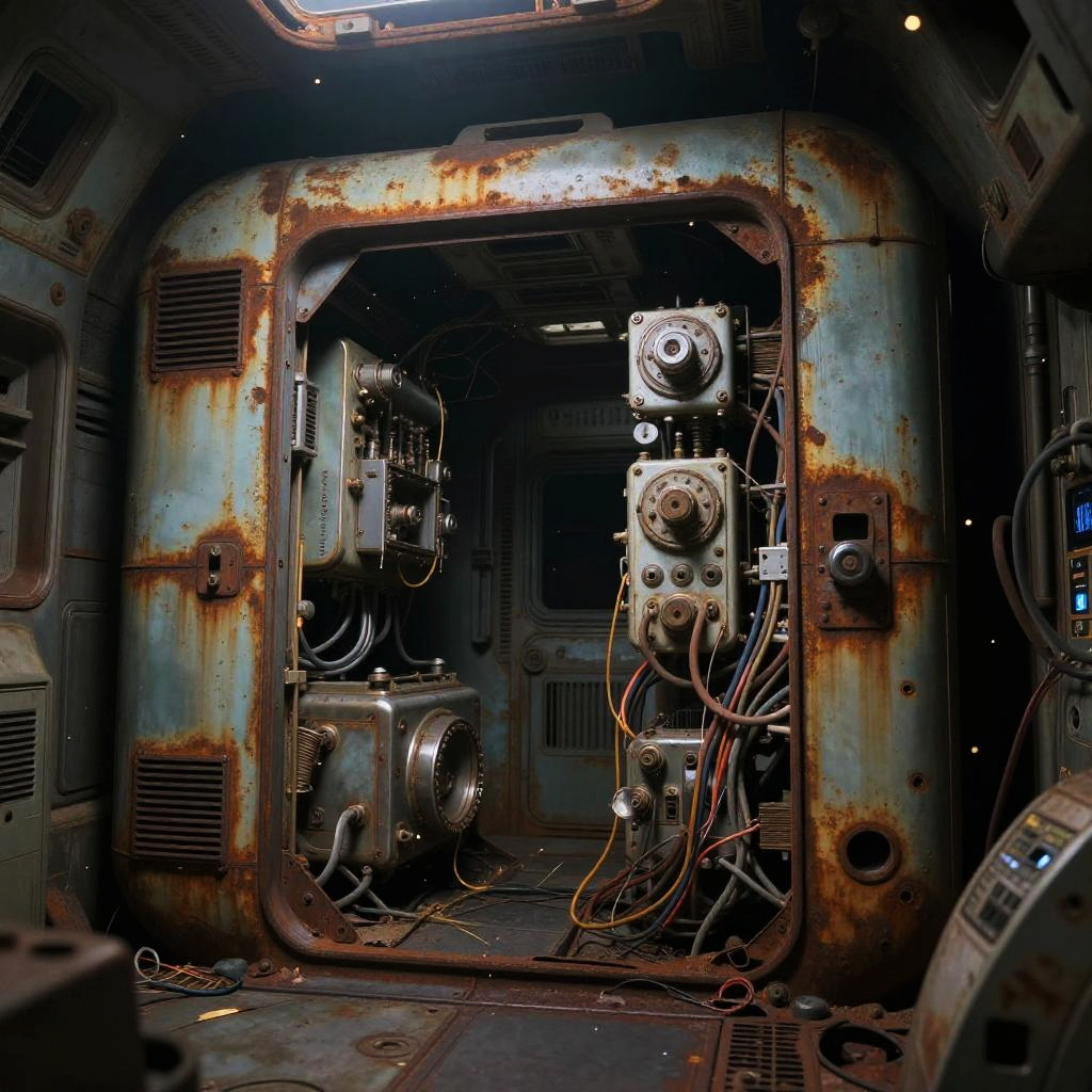 Innards of an abandoned spaceship uncovered, rusted metal panels peeled back to reveal complex machinery and tangled wires, eerie sci-fi atmosphere, dark and moody lighting, highly detailed interior with metallic textures and sparks.