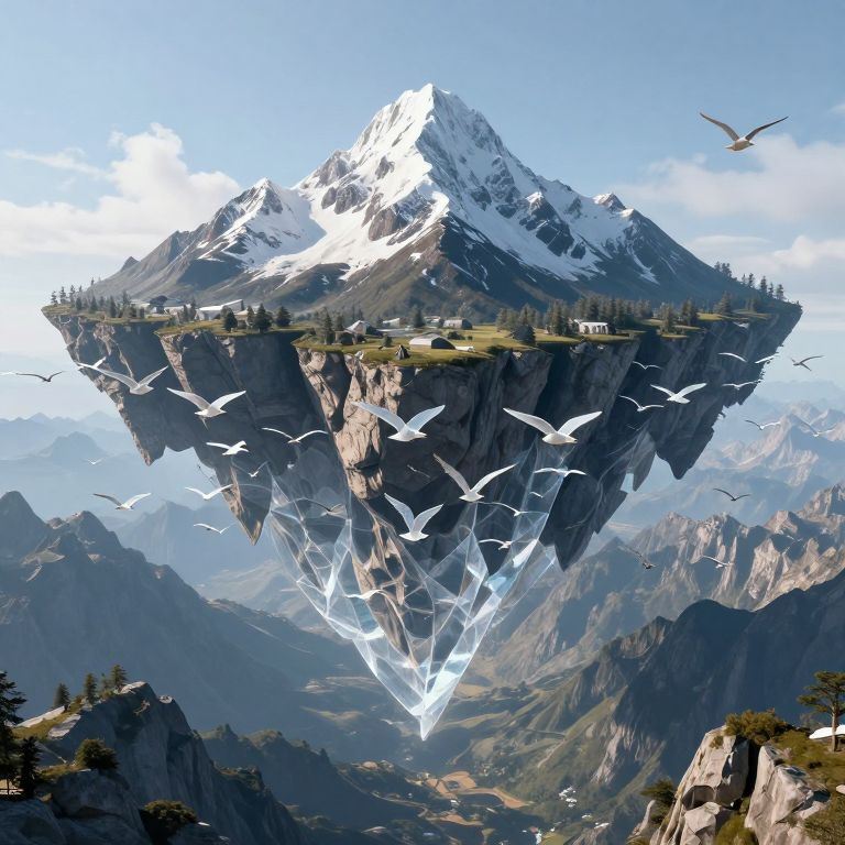 Fantastical digital art of a floating mountain island with snow-capped peak, birds flying, and a small village, set against a majestic mountain range