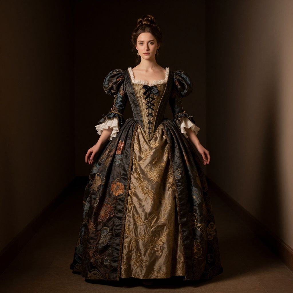 In this captivating portrait, a beautiful young woman with a chignon hairstyle stands elegantly in a dark corridor, bathed in dramatic chiaroscuro lighting. She is adorned in a sumptuous 1870s Victorian ball gown, featuring a massive overbust and voluminous sleeves, accentuating her graceful form. Her arms and hands are delicately poised, adding to the poise and sophistication of her demeanor. The minimalist background, with its warm tones and soft shadows, contrasts beautifully with the rich textures of her dress and the intricate details of her attire. The overall composition is masterfully arranged, with the woman positioned centrally, drawing the viewer's eye to her intricate dress and the subtle interplay of light and shadow that defines the scene.