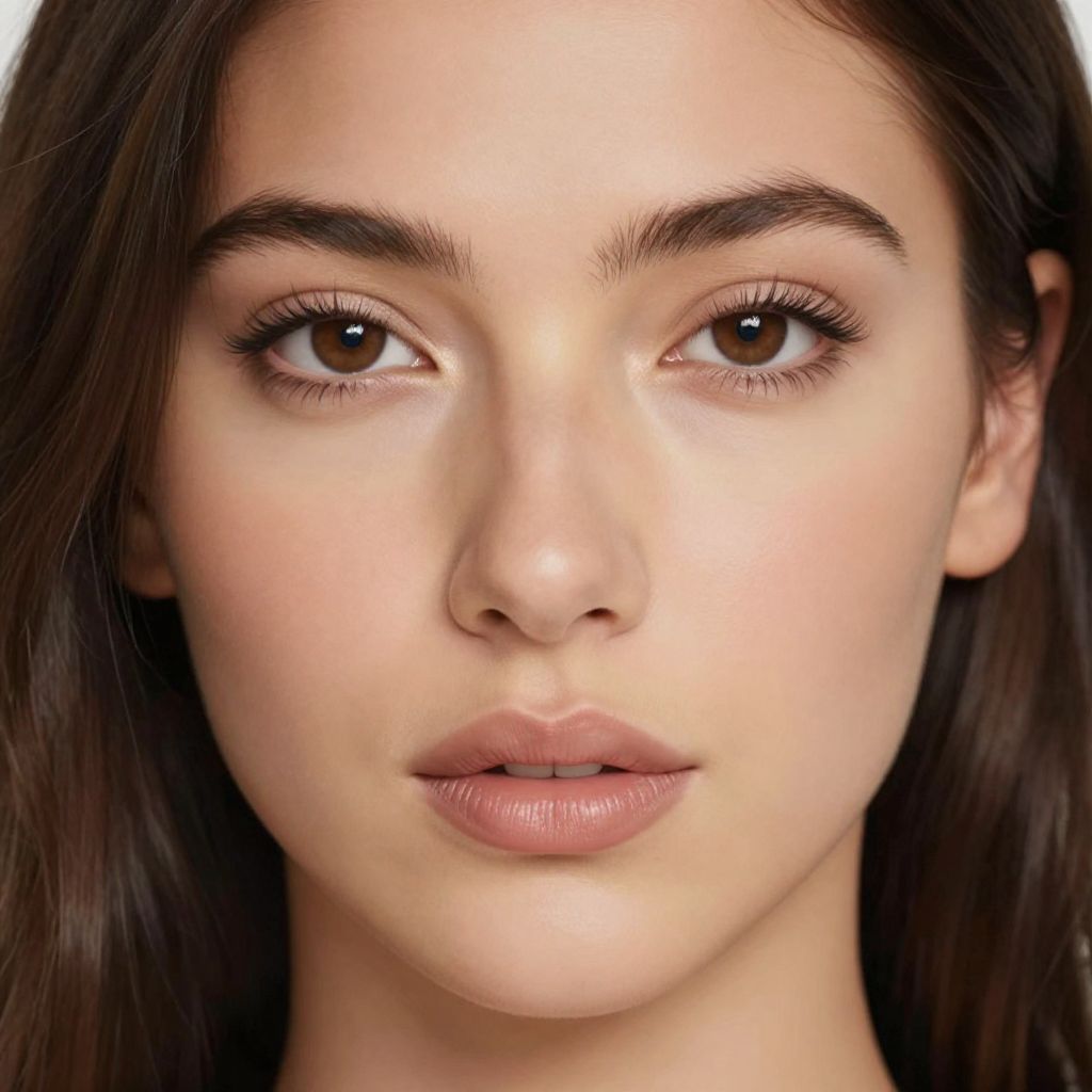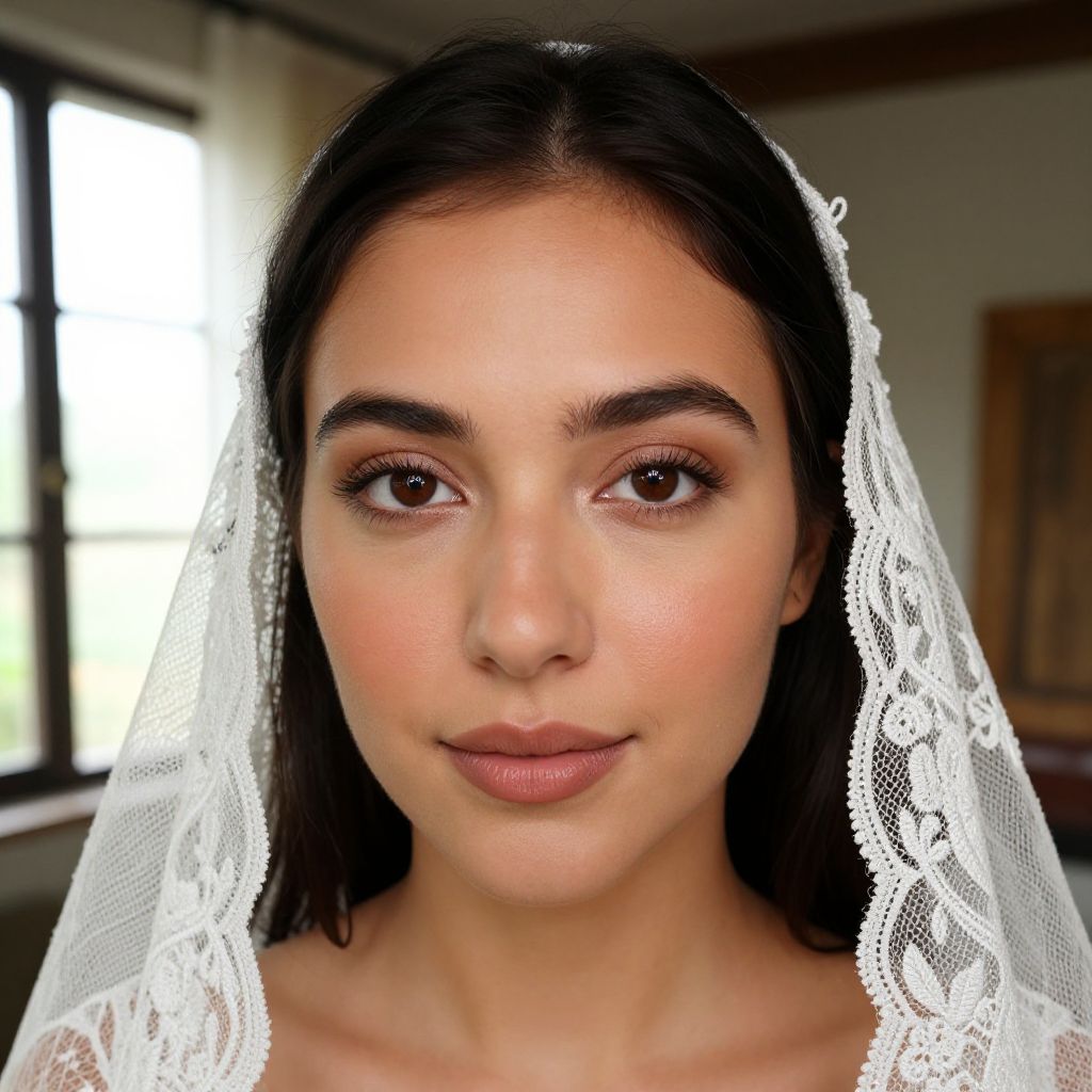 Photograph of a young woman with olive skin, dark brown eyes, and straight black hair. She wears a white lace veil over her head, framing her face. Her makeup is subtle, with light pink eyeshadow and nude lipstick. She has well-groomed eyebrows and a calm expression. The background is blurred, featuring a window with bright light on the left and a wooden door on the right. The overall lighting is soft, highlighting her face. She appears to be indoors, possibly in a room with wooden furnishings.