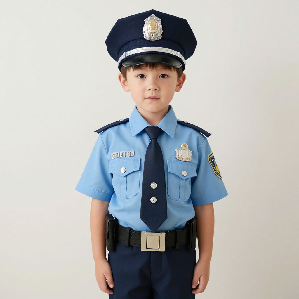 Photograph of a young boy in a light blue police uniform with dark blue hat and tie, standing against a plain white background.