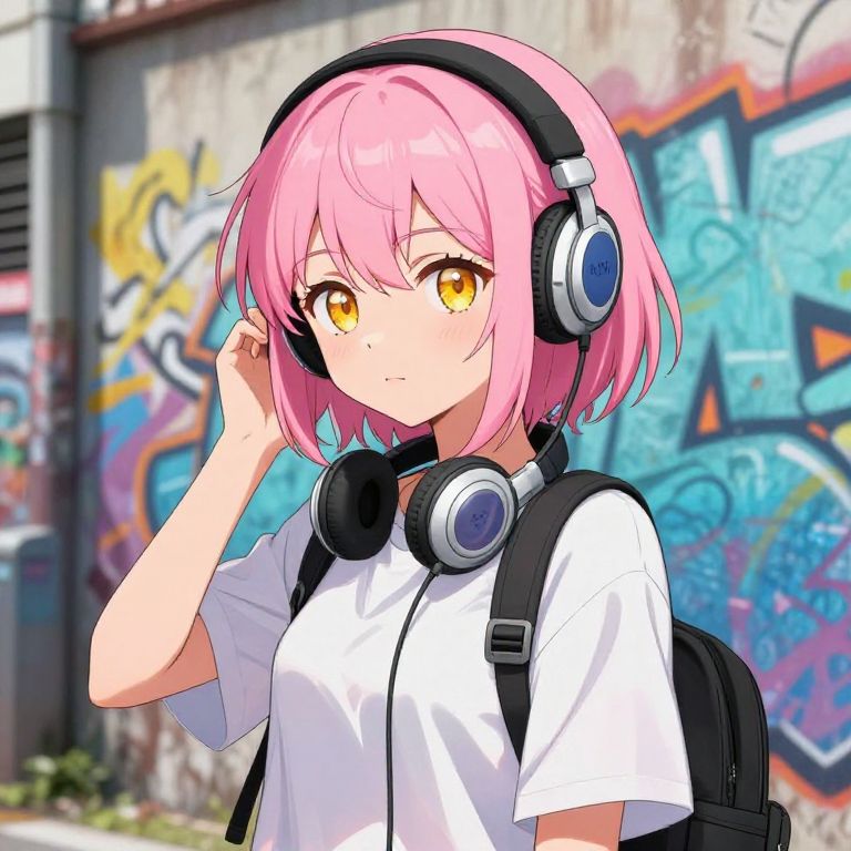 Create an anime girl with short pink hair and big expressive amber eyes, wearing casual streetwear with headphones, posed in front of a colorful urban graffiti wall, bright daylight, energetic and youthful vibe with detailed shading.