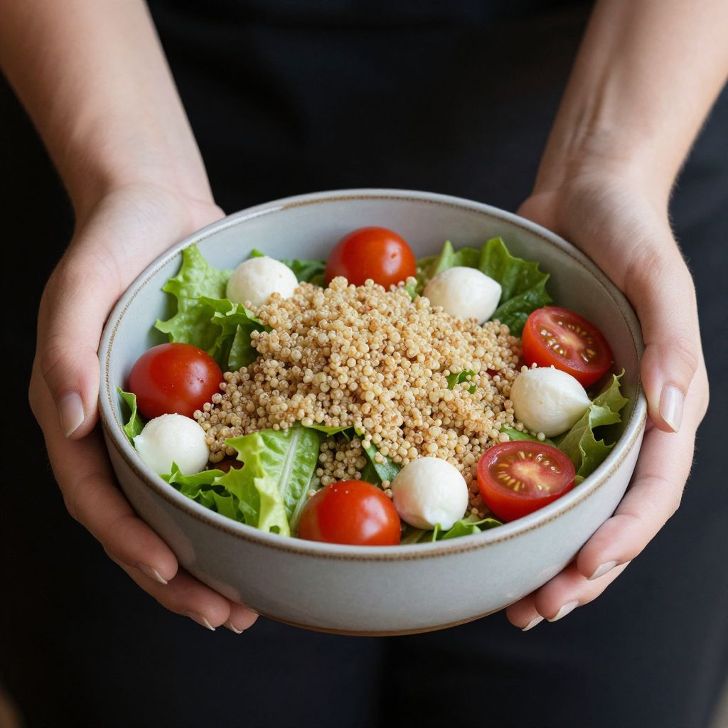 Woman's hands gently cradle a rustic ceramic bowl filled with a vibrant salad of fresh green lettuce, cherry tomatoes, creamy mozzarella pearls, and golden quinoa, showcasing a harmonious blend of textures and colors.
