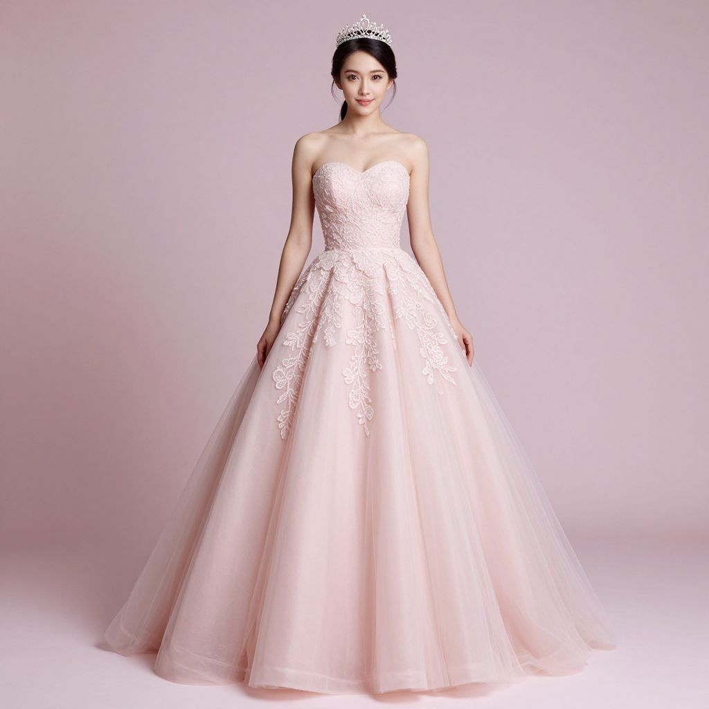 Elegant woman wearing a strapless pink gown with intricate lace detailing and a voluminous tulle skirt, complemented by a sparkling tiara, stands gracefully against a soft pink backdrop.