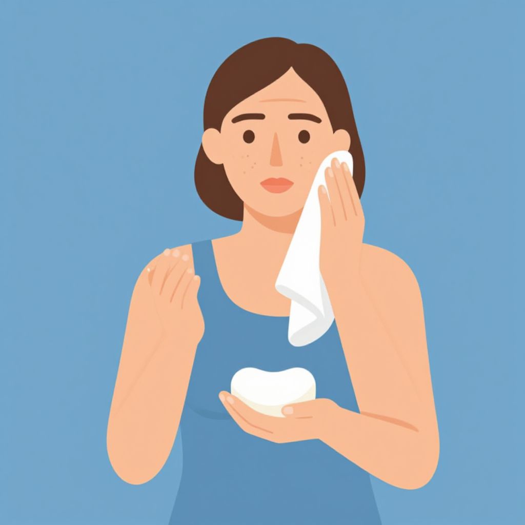 Digital illustration of a light-skinned woman with short brown hair, wearing a blue sleeveless top. She is applying a white, soapy cloth to her right cheek with her right hand, while holding another soapy cloth in her left hand. The background is a solid light blue. Her expression is neutral with slightly raised eyebrows. The style is simple and cartoon-like, with flat colors and minimal shading. Her freckled face and the soapy texture are clearly depicted.