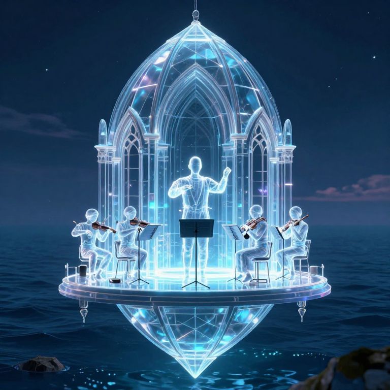 Digital CGI of a glowing, translucent dome with a conductor and musicians playing instruments, floating on a calm ocean at night.