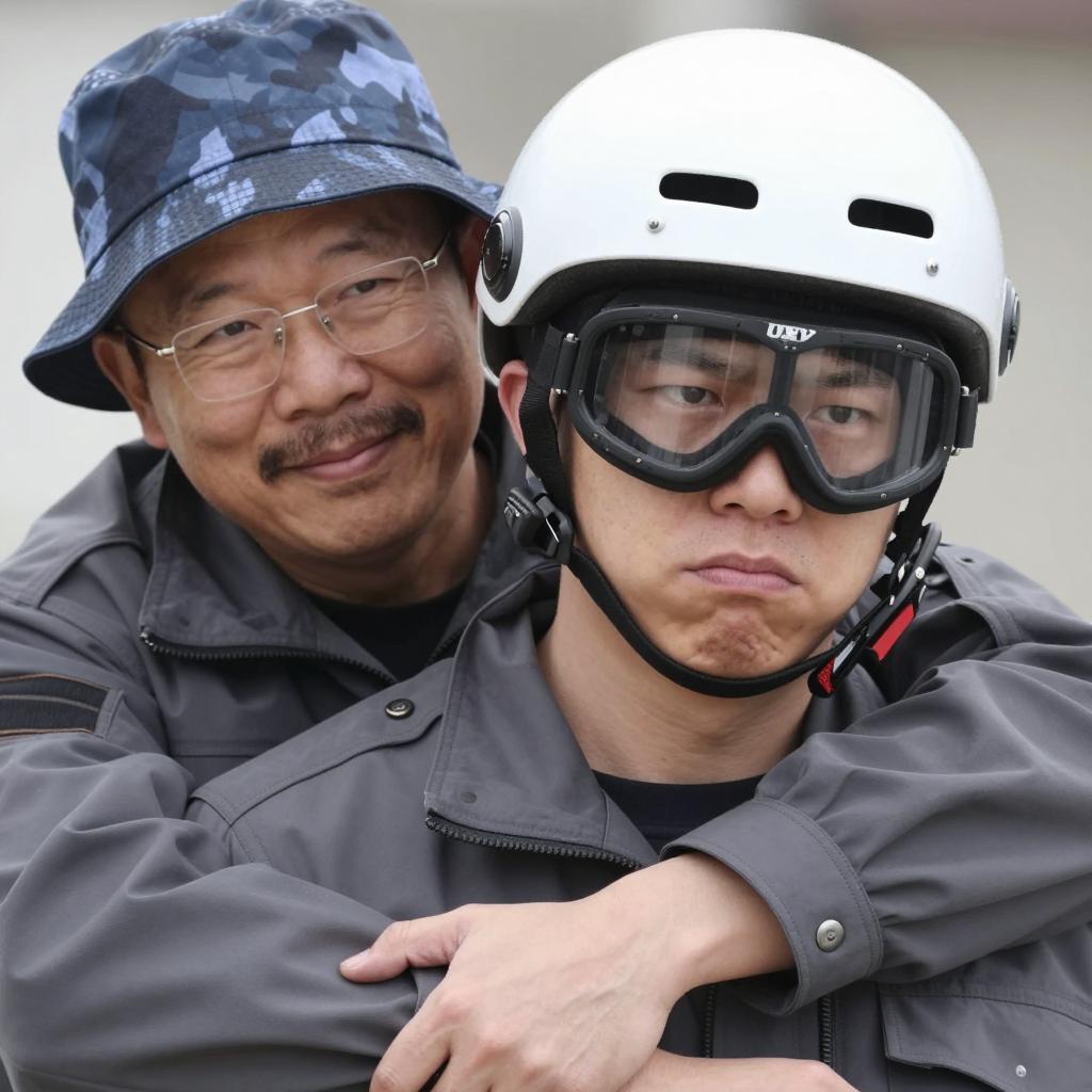Two Asian men dressed in gray jackets, one in front wearing a white helmet and black goggles looking slightly annoyed, and the other smiling behind wearing a blue camouflage bucket hat and clear glasses, embracing the man in front from behind.