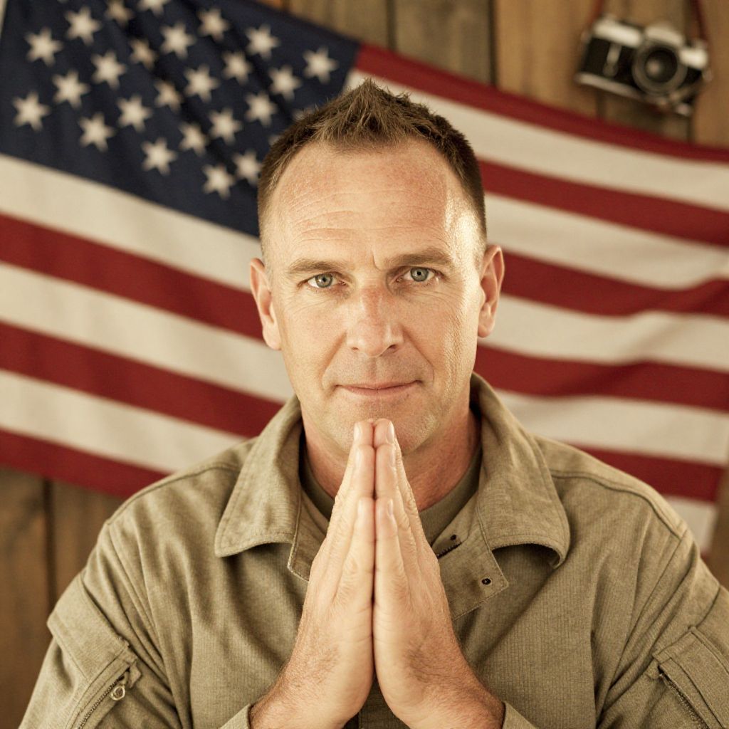 A photograph of a middle-aged white man with short brown hair, wearing a green, button-up, military-style shirt. He is positioned in front of a slightly blurred American flag, which is hung on a wooden wall. The man has a light skin tone, blue eyes, and is smiling gently. His hands are clasped together in a prayer position in front of his face. A small, vintage camera is mounted on the wooden wall in the upper right corner. The image has a warm, slightly sepia tone, giving it a nostalgic feel.
