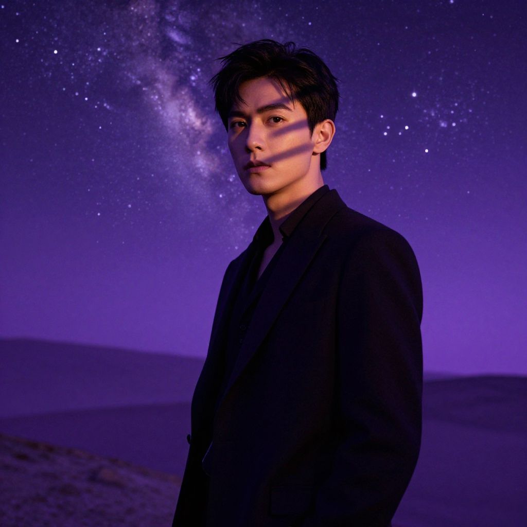 Photograph of an Asian man with short, dark hair standing under a starry night sky illuminated by the Milky Way. He has a serious expression, with a shadow cast across his face by a light source from the left. He wears a black, open-collared shirt. The background features a deep purple sky with countless stars and a visible Milky Way cluster. The foreground includes a sandy, slightly blurred landscape. The overall lighting creates a dramatic, moody atmosphere. The man is positioned slightly to the right of the center.