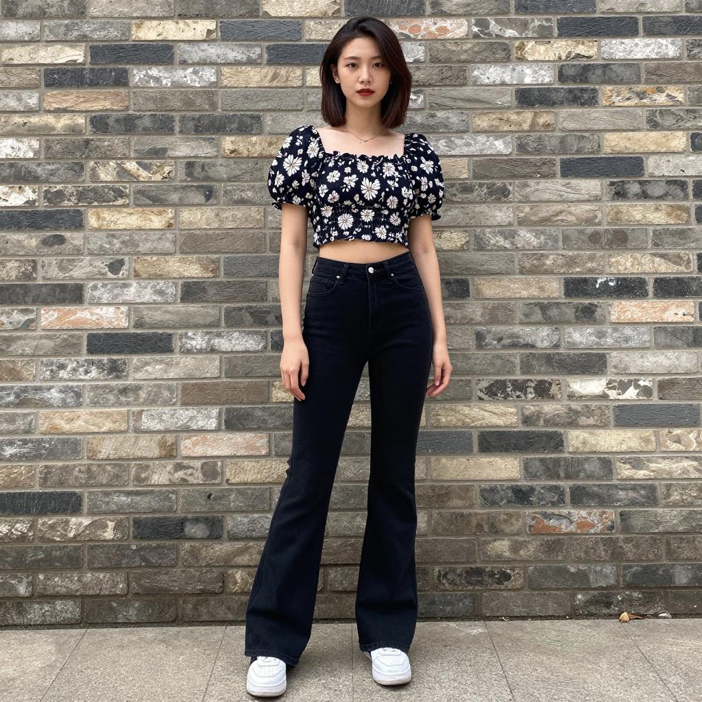 The image features a young woman standing confidently against a stylish brick wall. She is wearing a floral crop top and black flared jeans, complemented by white sneakers, showcasing a trendy and casual fashion style.