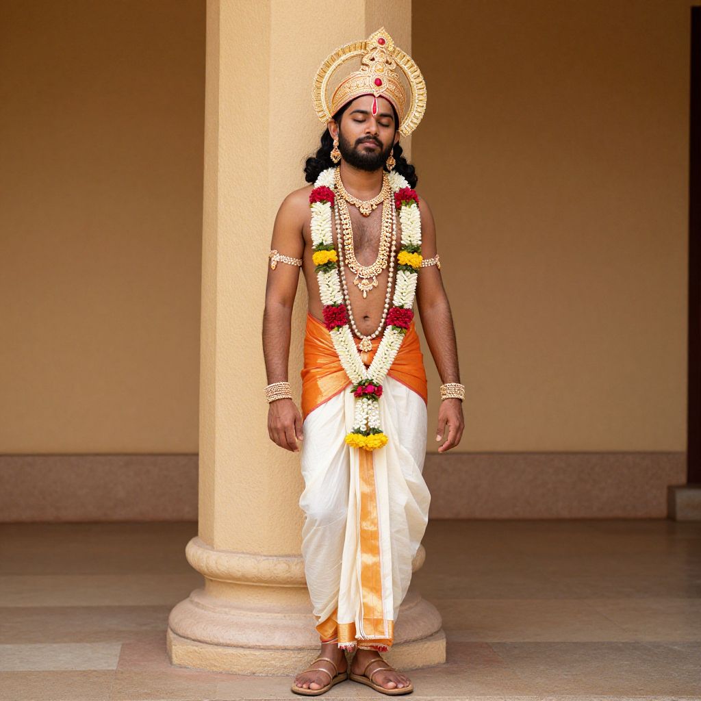 Sri krishna costume, 1boy, male focus, solo, facial hair, dark skin, dark-skinned male, sandals, beard, pillar, closed eyes, jewelry, column