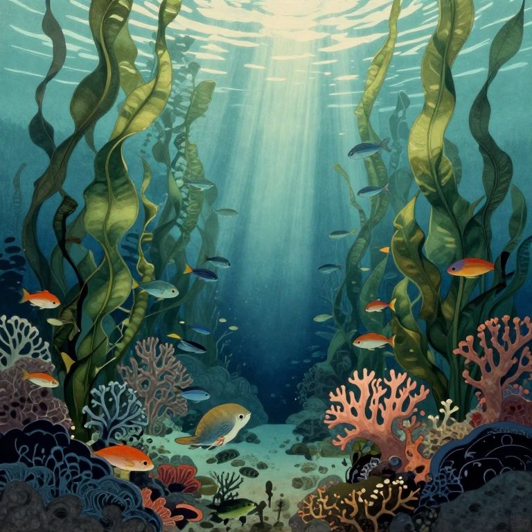 A captivating digital art piece depicts an enigmatic underwater realm, reminiscent of traditional Japanese ukiyo-e woodblock prints. From the vantage point of a diminutive aquatic creature navigating lush kelp forests, intricate coral formations and vibrant schools of fish are meticulously detailed. Sunbeams piercing through the water envelop the surroundings in a celestial luminescence, instilling a sense of serenity and awe while subtly alluding to concealed perils lurking beneath. The composition gradually transitions from placid to enthralling, beckoning viewers to embark on an exploratory journey through this mesmerizing aquatic wonderland with fascination and reverence.