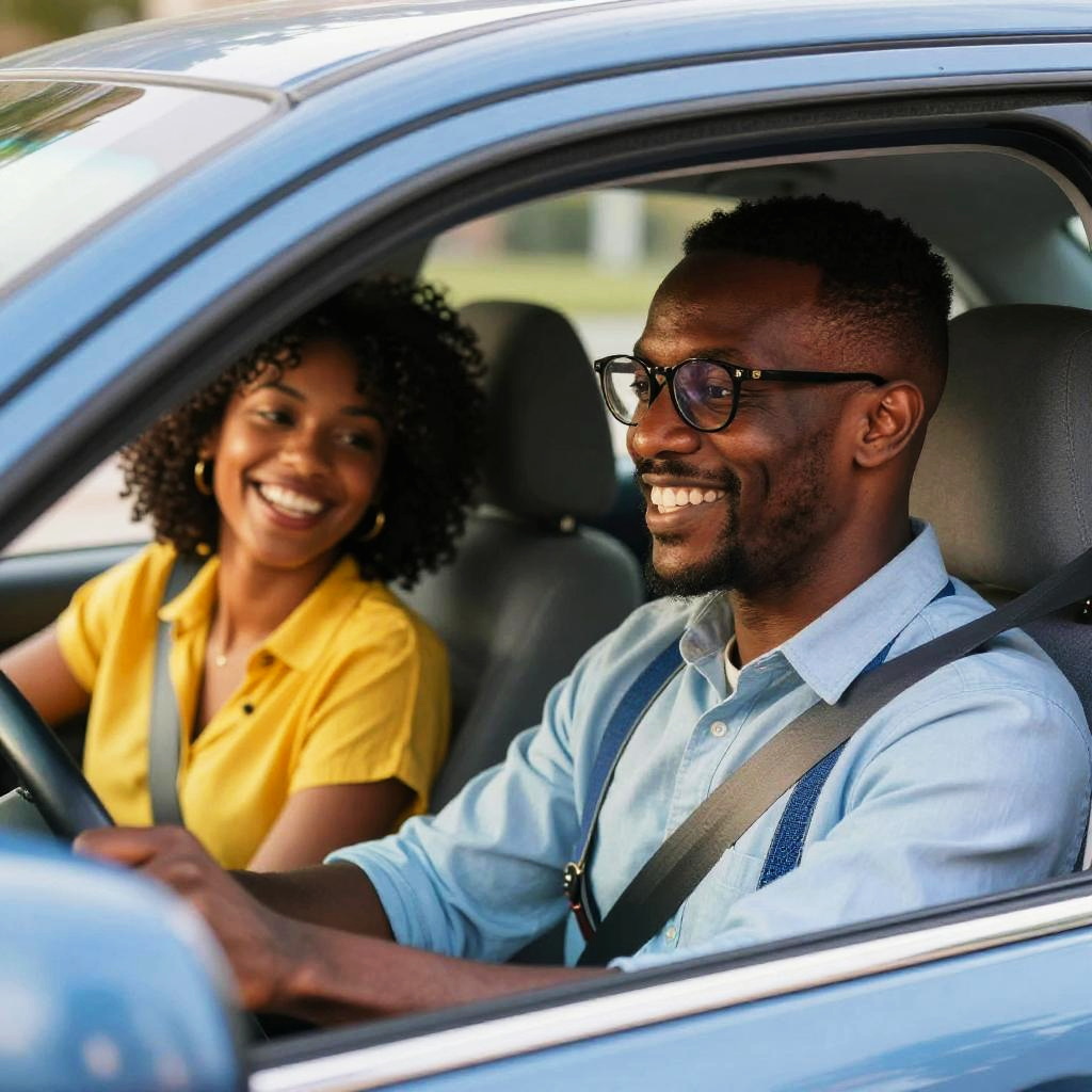 Photograph of a smiling young woman with straight black hair and light skin, seated in the passenger seat of a car. She wears a white top and looks at the bearded man driving, who has short dark hair, light skin, and is dressed in a light blue shirt. He's focused on the road, holding the steering wheel with both hands. Sunlight streams through the car's windows, creating a bright, cheerful atmosphere.