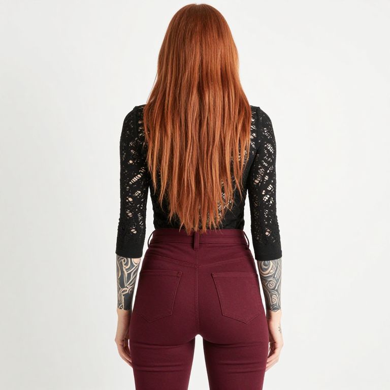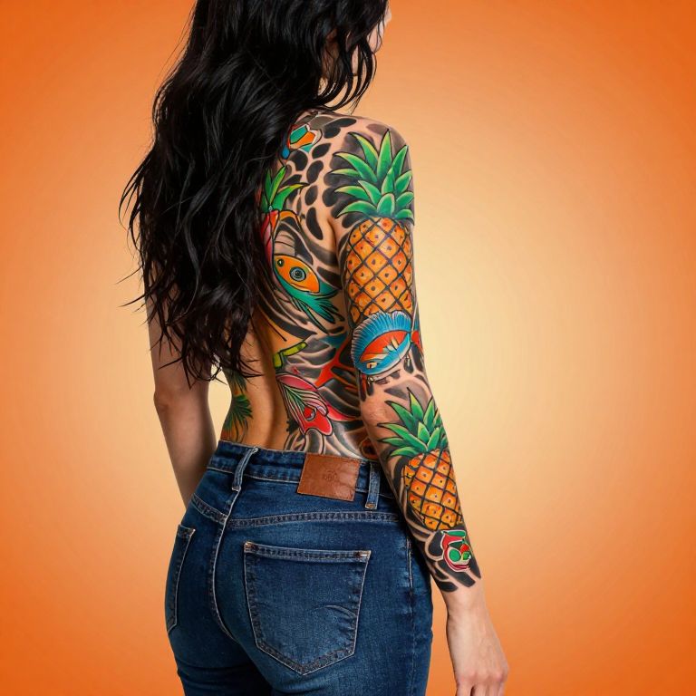 Photograph of a person with long black hair, standing with back to camera, showcasing a vibrant, full-back tattoo sleeve. The tattoos feature colorful designs like pineapples, fish, and abstract patterns in bright greens, oranges, blues, and blacks. They're wearing dark blue jeans with a leather patch on the back pocket. The background is a soft, gradient orange.