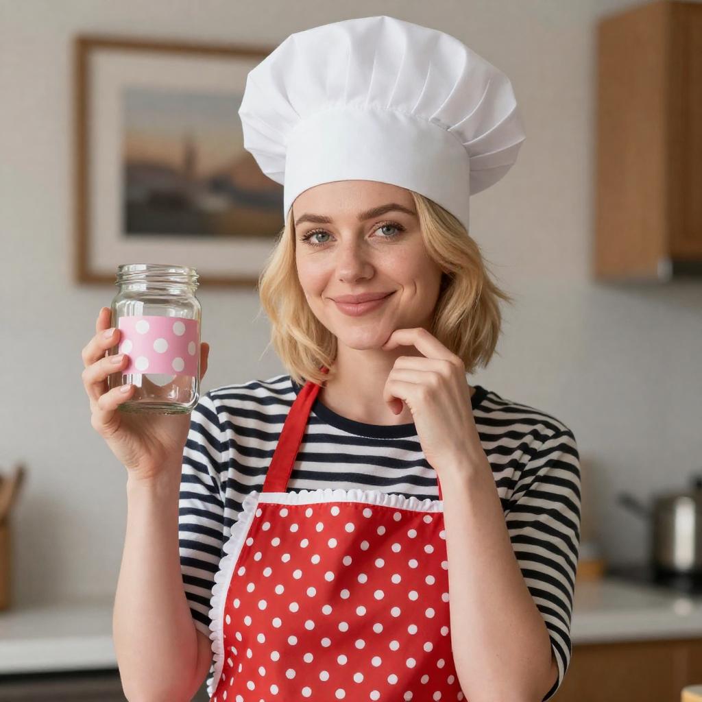 Portrait of a smiling blonde woman wearing a white chef hat and a red polka dot apron with white frills over a black and white striped shirt. She is holding a clear glass jar decorated with a pink polka dot label, touching her chin with her right hand. The background features a blurred home kitchen interior with a framed picture on the wall.