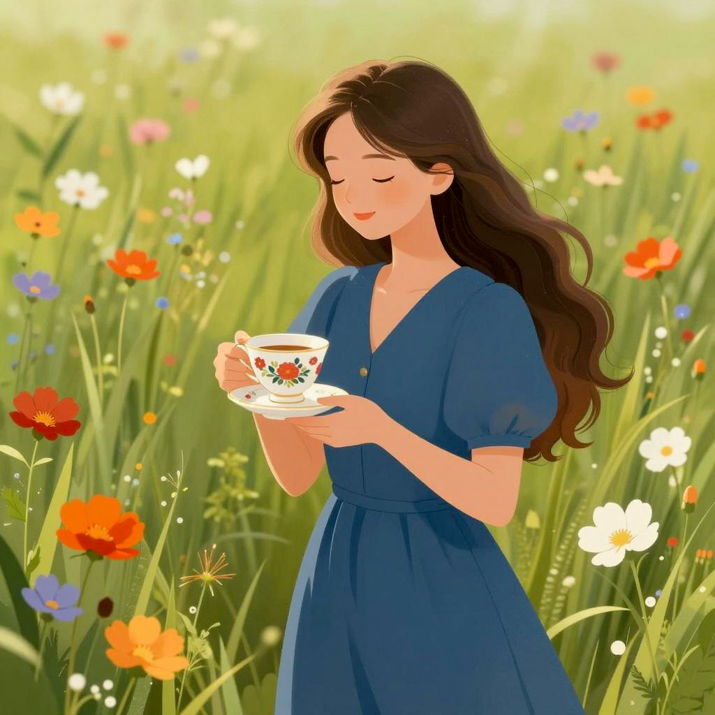 Illustration of a young woman with long, wavy brown hair, wearing a dark blue dress, holding a floral teacup in both hands. She is standing in a vibrant field of colorful wildflowers, including red, orange, and white flowers. Her eyes are closed, and she has a gentle smile. The background is filled with tall green grass and more wildflowers. Her hands rest at her waist level. The light is bright, creating a soft glow around her.