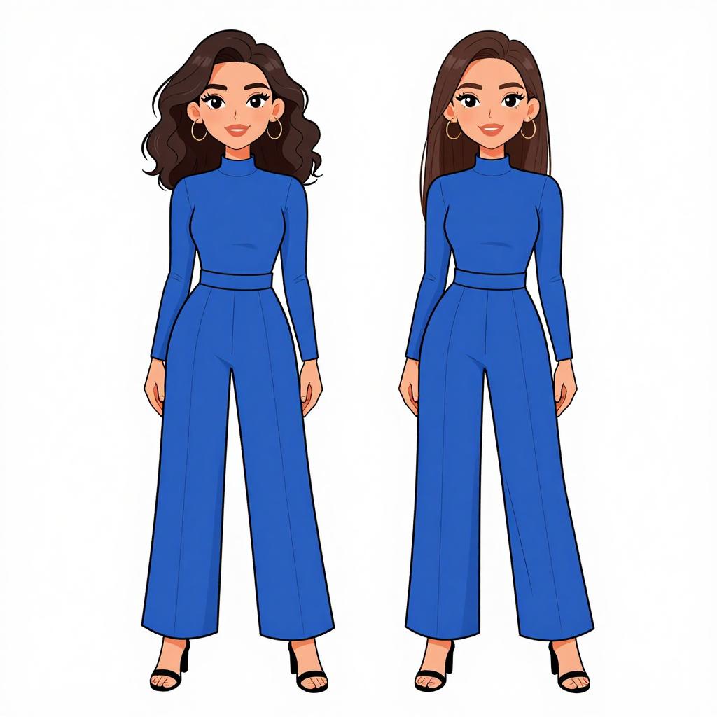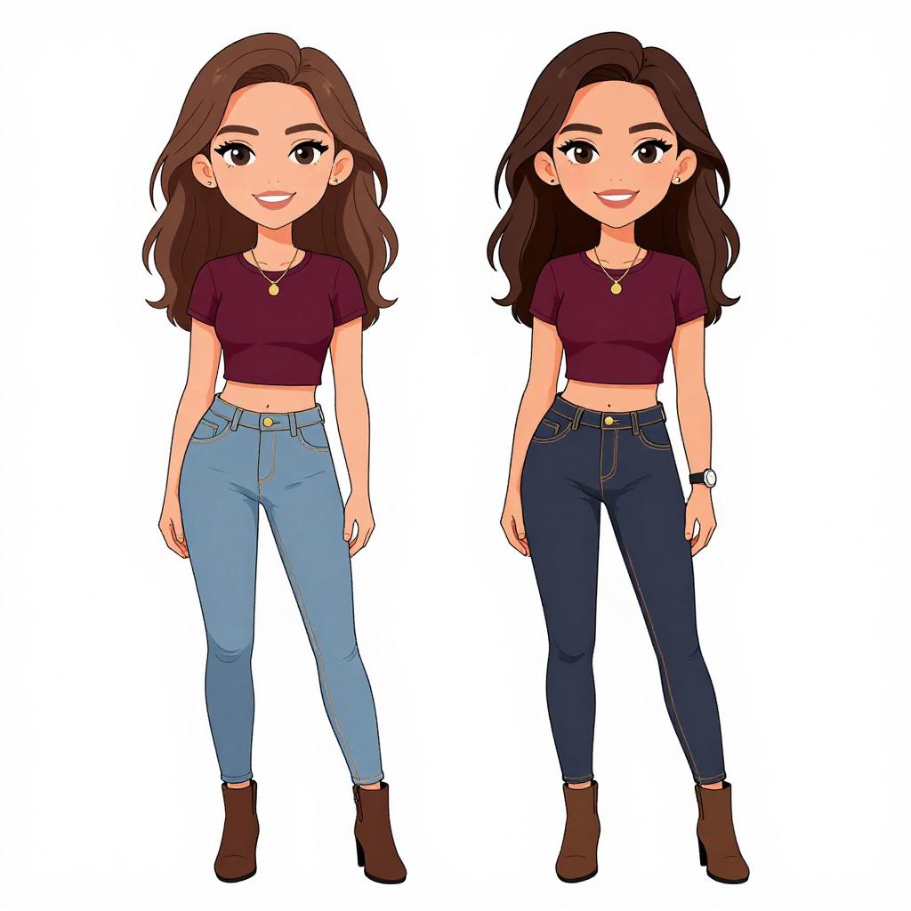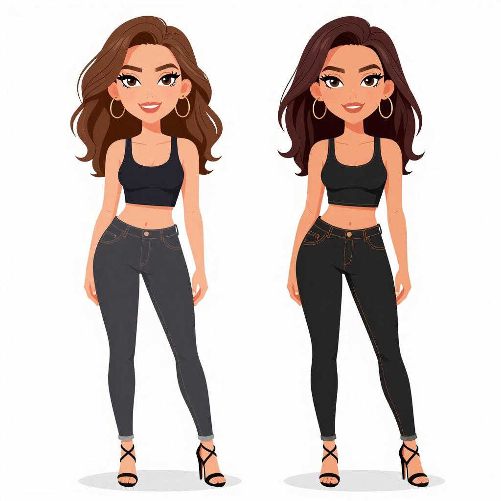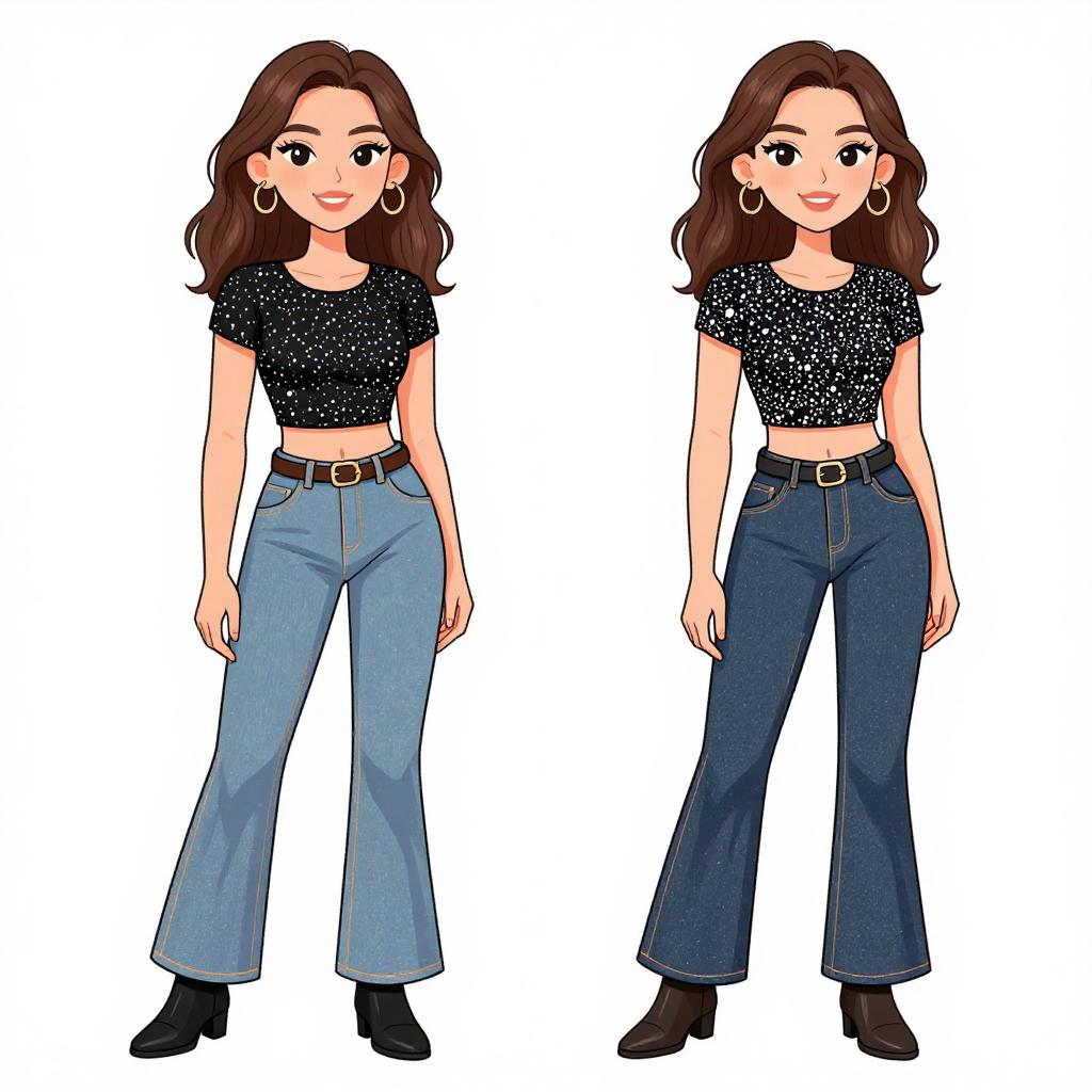 Woman with pretty face and pretty hair. smiling Woman, casual chic, black and white speckled crop top with short sleeves, low-rise blue denim flared jeans, thin brown leather belt with a small buckle, black ankle boots with low heels, white studio background. --sref 1467