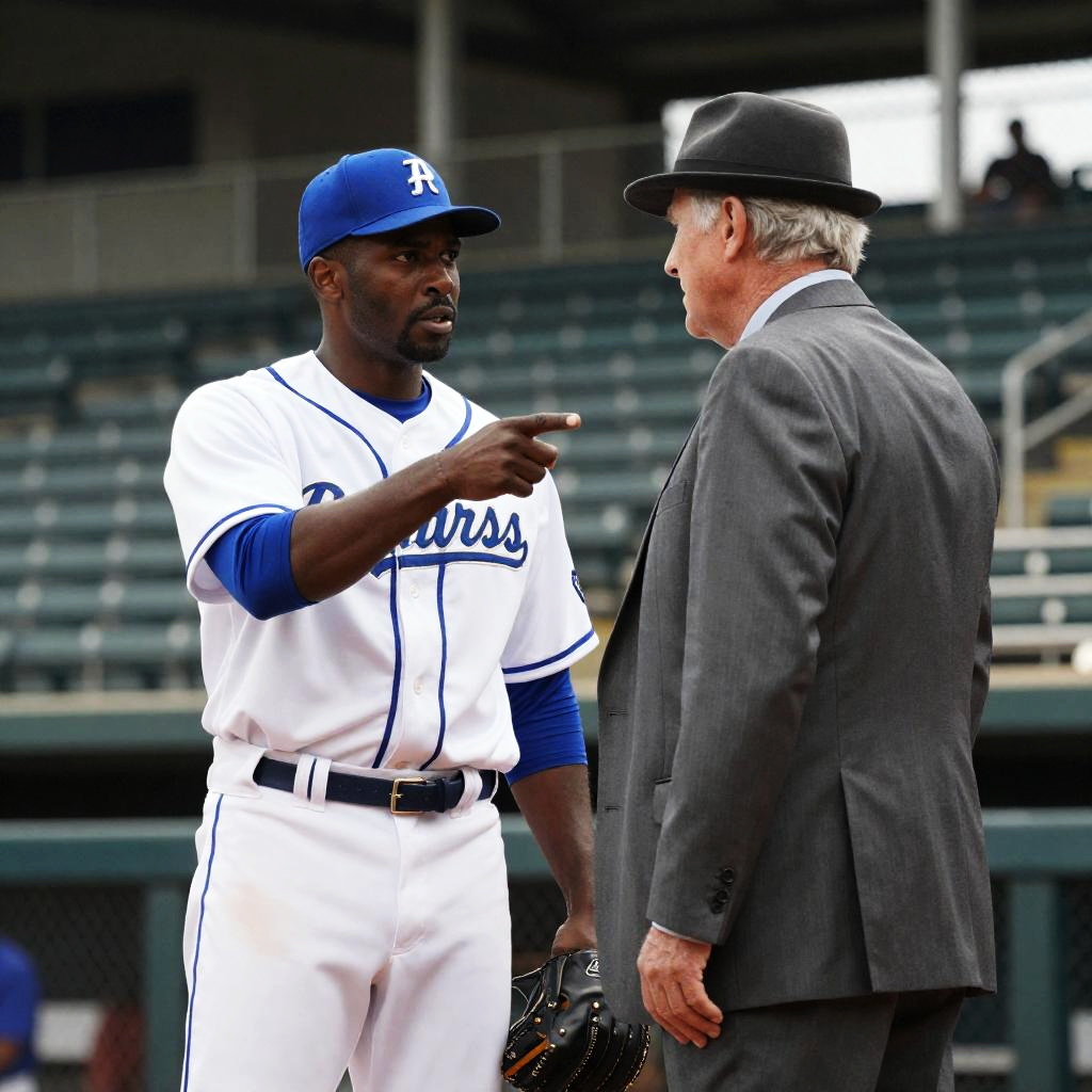 Photograph of a black male baseball player in a Dodgers uniform, blue cap, holding a glove, standing on the field. Background includes a white male player in a white uniform, seated spectators, and stadium seats. Intense facial expression on the Dodgers player. Blurred spectators in the background.