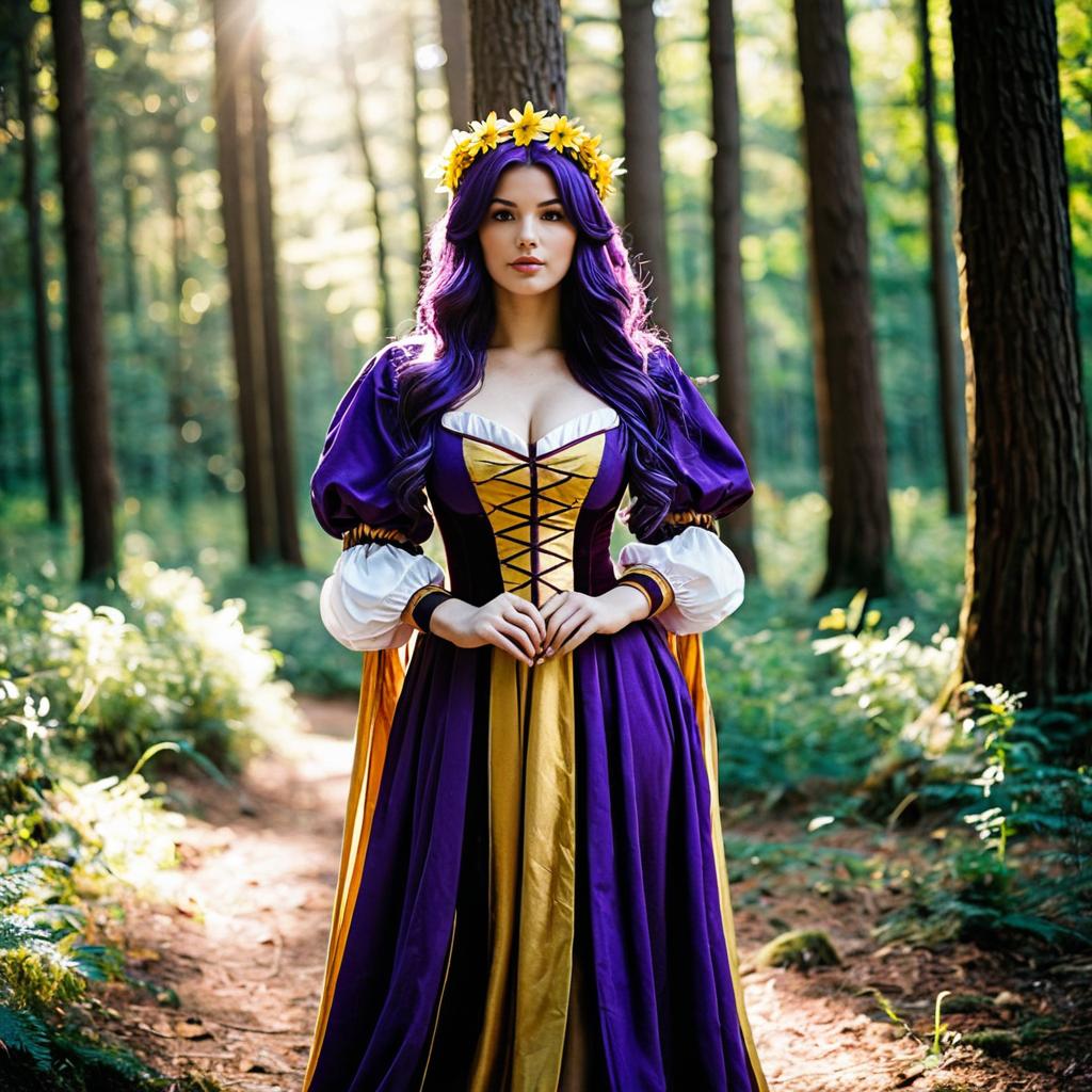 German fest dress costume, photorealistic portrait of a young woman wearing a colorful medieval-style dress with puffed purple sleeves, green and red bodice with corset lacing, and multi-colored striped skirt, standing in front of a cherry blossom tree, daylight, blurred background, fair skin, brown hair in an elegant updo, serious expression, natural light, detailed ures on dress fabric, slight bokeh effect, spring setting, realistic details, soft shadows, charming and elegant aesthetic