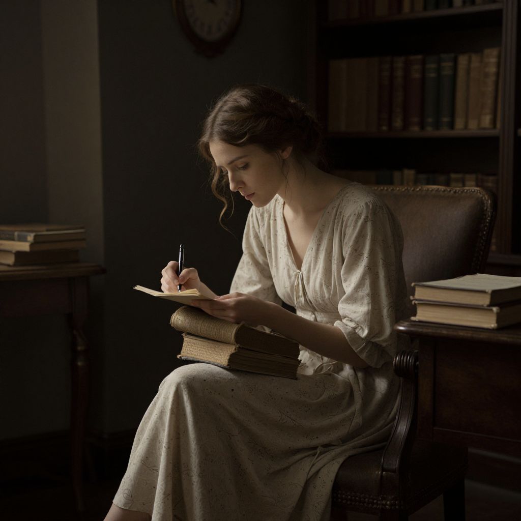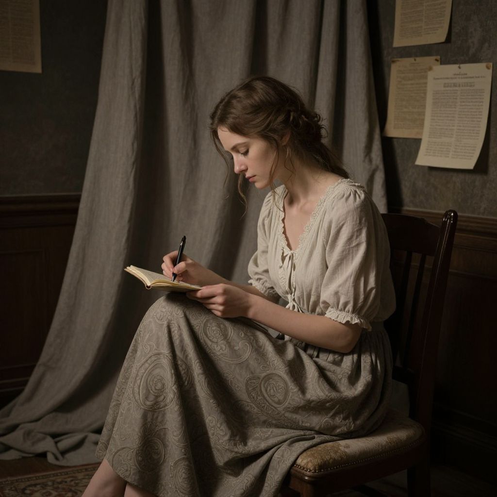 In a quiet chamber draped in shadows and adorned with the whispers of history, a woman sits alone, her pen tracing thoughts onto paper, embodying the delicate balance between solitude and introspection, as the soft rustle of fabric and the faint scent of ink intertwine with the timeless pursuit of knowledge and self-discovery.