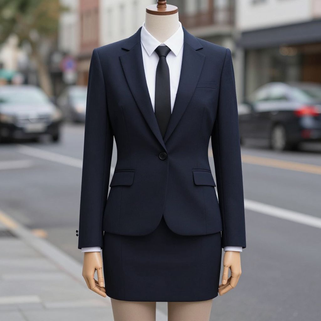Mannequin dressed in a navy blue women's business suit, featuring a blazer, white dress shirt, black necktie, and matching skirt. The outfit is displayed on a city street with blurred cars and buildings in the background.