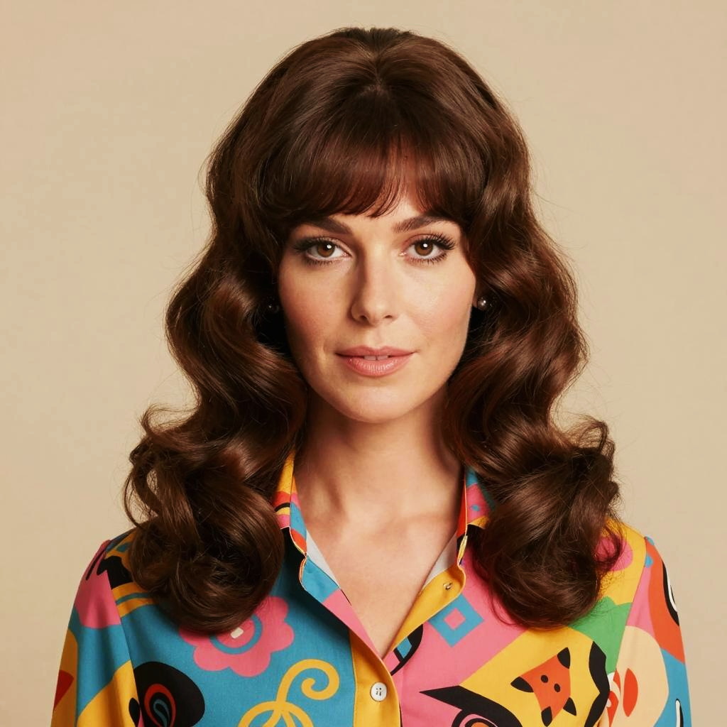 A portrait of a woman featuring a classic 70s hairstyle, complete with voluminous curls and bangs, complemented by a vibrant, patterned blouse reminiscent of the era's fashion trends.