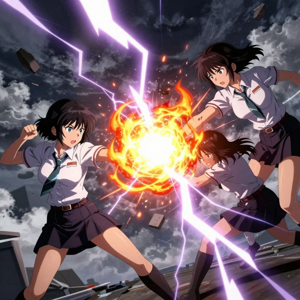 Three anime schoolgirls in white shirts and black skirts, wielding electricity and fire, fight amidst a stormy, ruined skyline. Dynamic, action-packed.