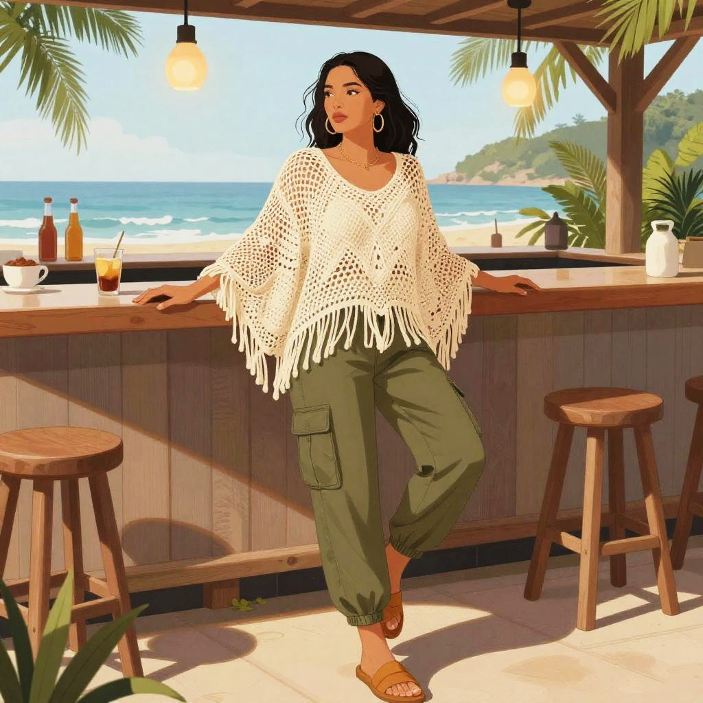 A Pear-shaped body type woman, in a casual bohemian style with an oversized cream crochet top featuring batwing sleeves and fringe detailing, paired with olive green cargo pants and tan slide sandals, relaxing at a beach bar surrounded by tropical plants, illustrated in the visual style of One Peace Books. Sexy
