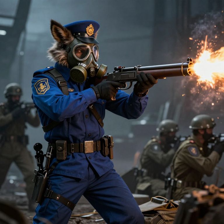 A dark fantasy and sci-fi themed image featuring a furry character dressed as an officer in a blue uniform with a matching hat and gas mask, firing a shotgun. The character, with animal-like ears and fur facial features, is in an action pose amidst a group of soldiers in tactical gear, suggesting a futuristic or alternate reality combat scenario.