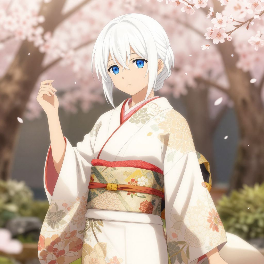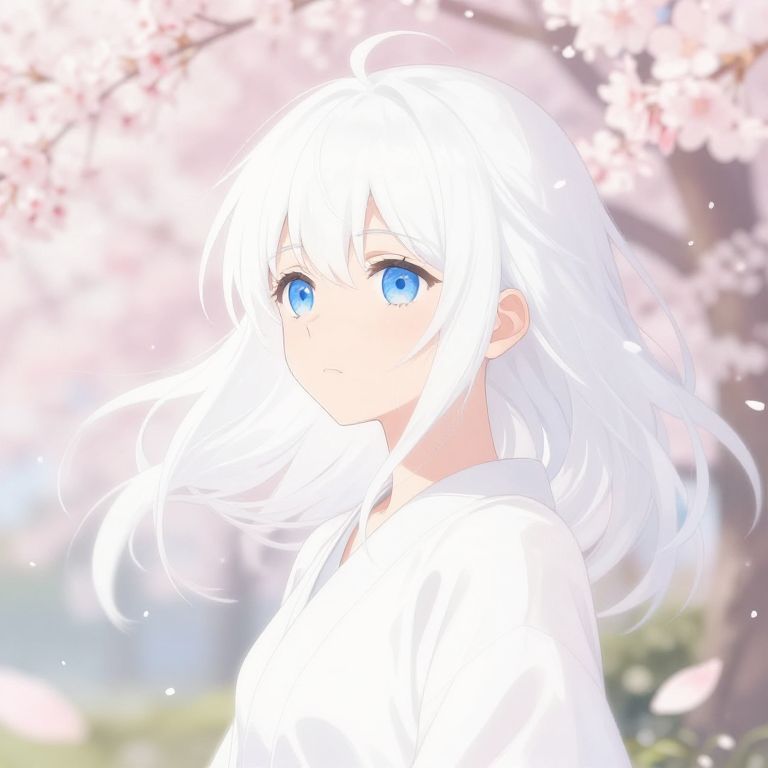 White hair blue eye anime girl in a tranquil cherry blossom garden, soft petals falling around her, her icy blue eyes calm and contemplative, flowing white hair catching the gentle breeze, delicate shading, bright pastel colors, serene and peaceful mood.