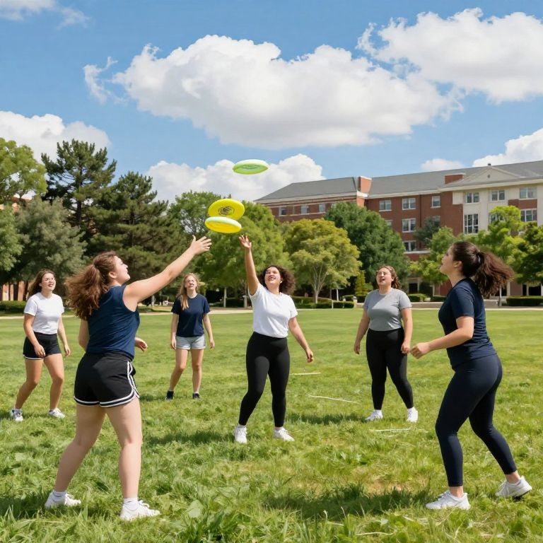 Curvy college girls playing frisbee on a green university lawn, bright sunny day, active and energetic poses, casual sportswear, diverse group, joyful and spirited expressions, vibrant blue sky with fluffy clouds, detailed natural landscape with trees and campus buildings.