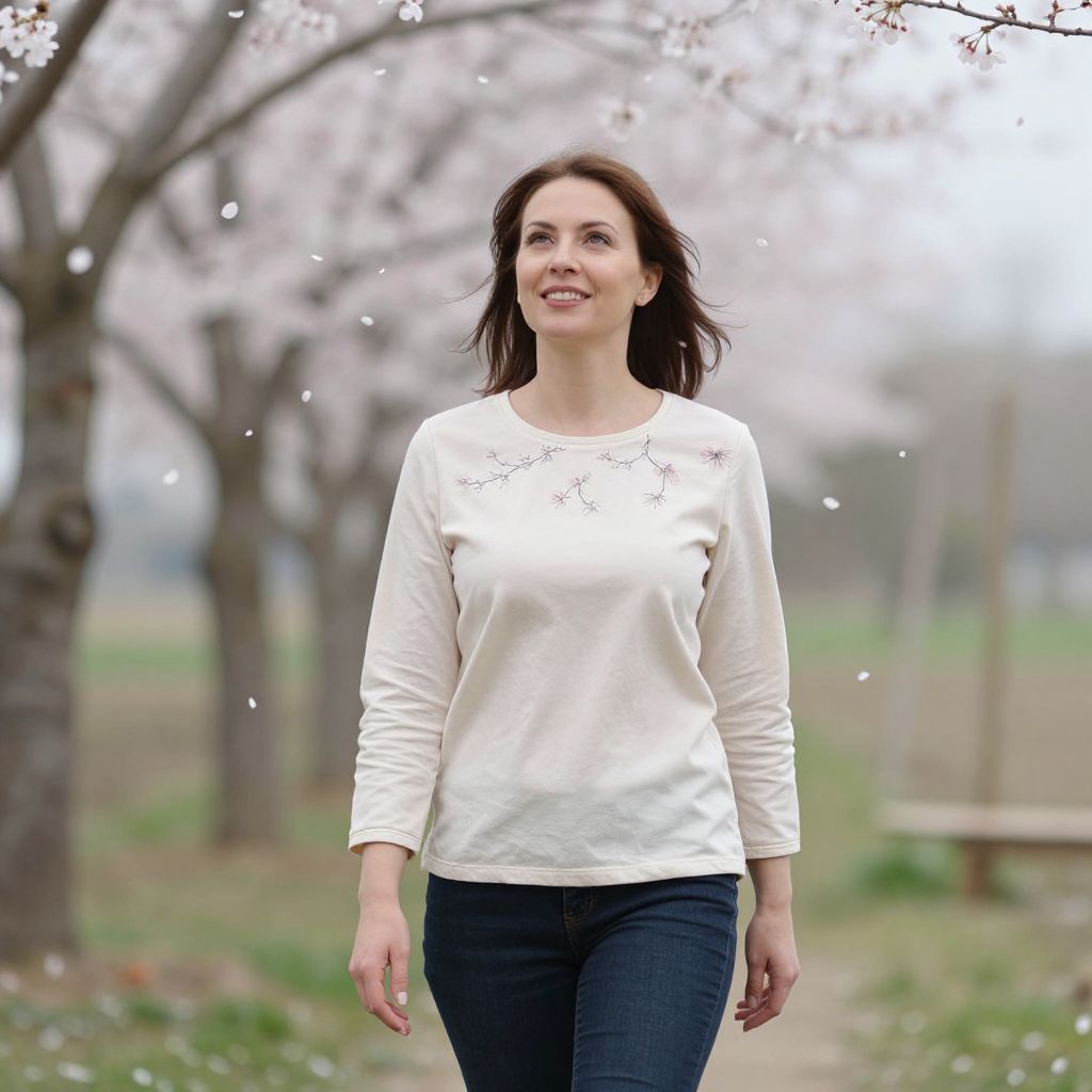 A fit 30-something woman with fair skin, curly auburn hair, and a friendly smile wearing a rich caramel-colored top with a delicate embroidered pattern, standing in a sun-drenched backyard with blooming roses and greenery, holding a reusable tote bag.