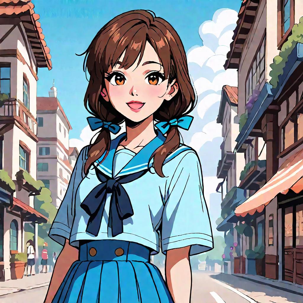 Score_9, score_8_up, score_7_up, score_6_up, score_5_up, score_4_up, source_anime, rating_explicit, 1girl, soro, brown hair, brown eyes, long hair, low twintails, hair ribbon, smile, 0looking at viewer, open mouth, blue sailor, blue skirt. ribbon, cowboy Shot, anime, anime_screencap, animated gif, mp4, video, animated