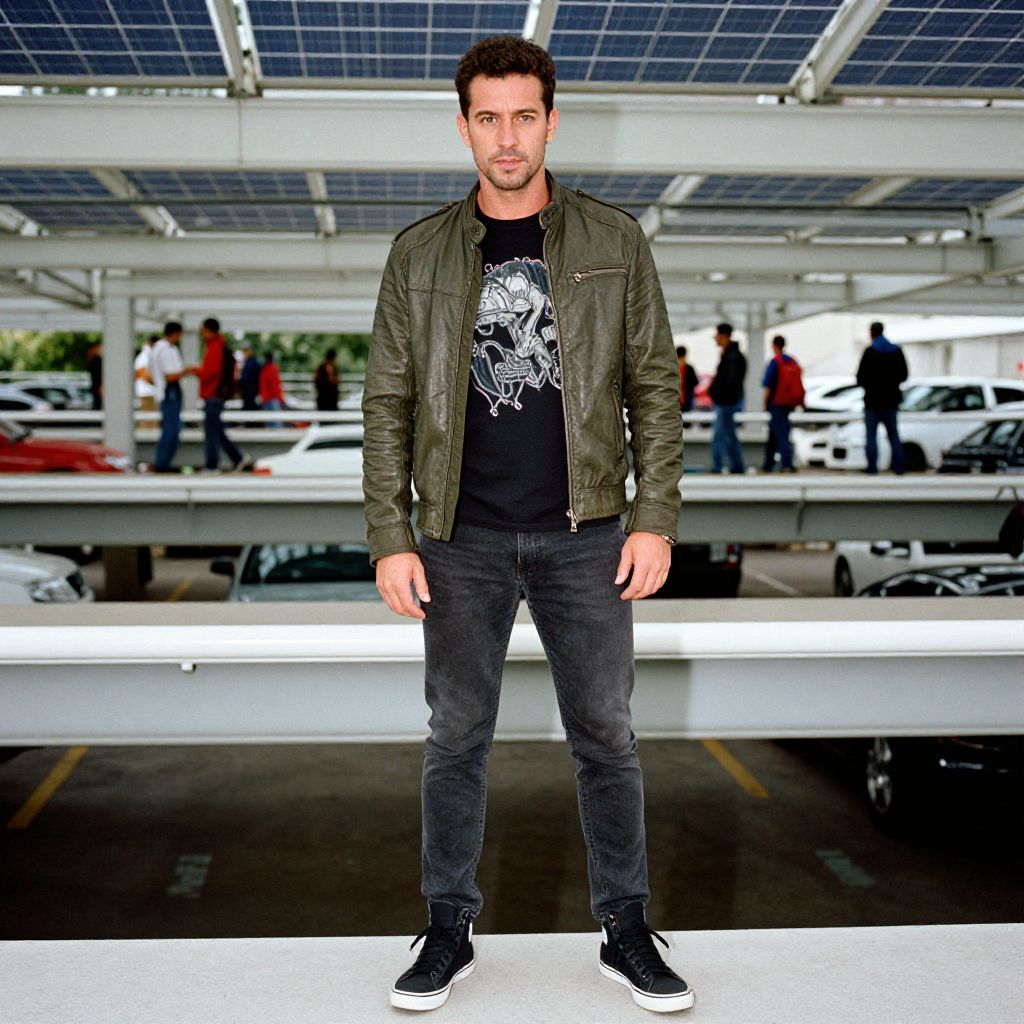 A man, olive green leather jacket, black graphic tee, dark grey skinny jeans, black high-top sneakers, multi-level parking structure, solar panels overhead, bustling commuter activity, technicolor film stock, confident expression Man has masculine face and piercing eyes