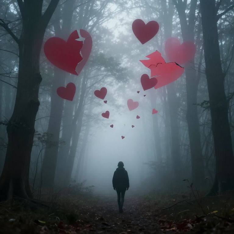 Misty forest path with silhouetted figure walking, surrounded by floating, broken red hearts. Dark trees, foggy atmosphere. Digital art.