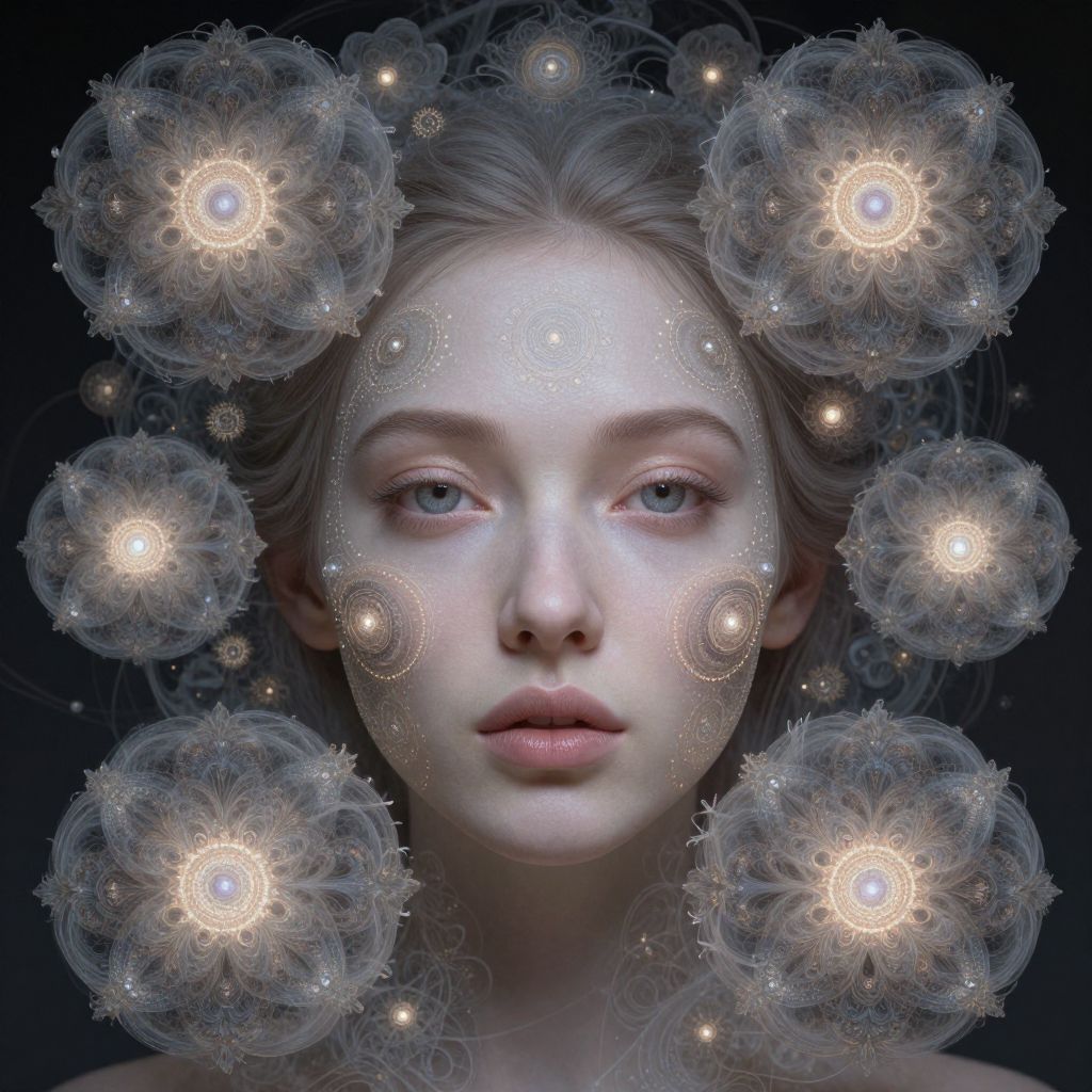 A hyper-realistic, ethereal image of a woman with intricate facial details, surrounded by spherical floral shapes and fractal patterns, evoking a sense of transcendent spirituality and otherworldly beauty.