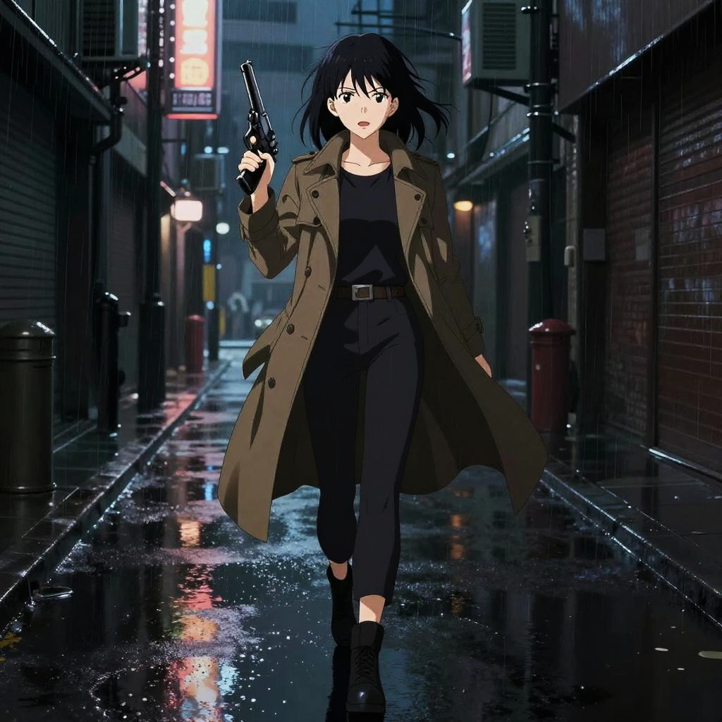 Anime-style digital illustration of a serious, black-haired woman in a trench coat and black pants, holding a gun, walking in a rain-soaked,