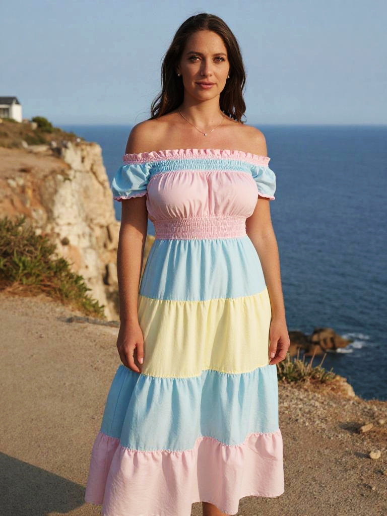 A Petite woman, in a casual summer color-blocked off-the-shoulder dress with ruffled neckline and tiered skirt in shades of pink, blue, and pale yellow, stands gracefully at a coastal cliff walk, captured in the vibrant visual style of AgfaColor film. Sexy. Pretty face and beаutiful eyes. Big breasts