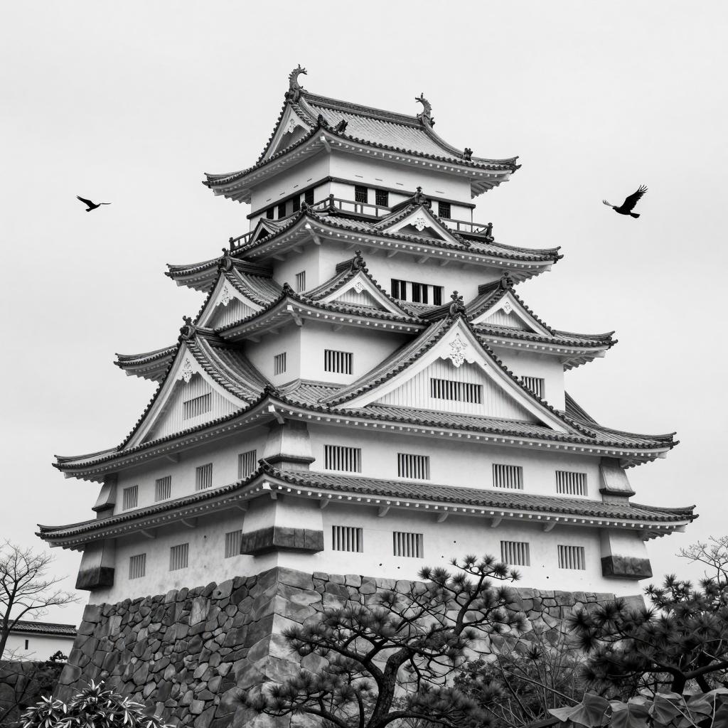 Black and white photo of a traditional Japanese multi-tiered castle with curved roofs and intricate architectural details. The castle is situated on a stone foundation surrounded by pine trees. Two birds are flying around the castle, enhancing the serene atmosphere.