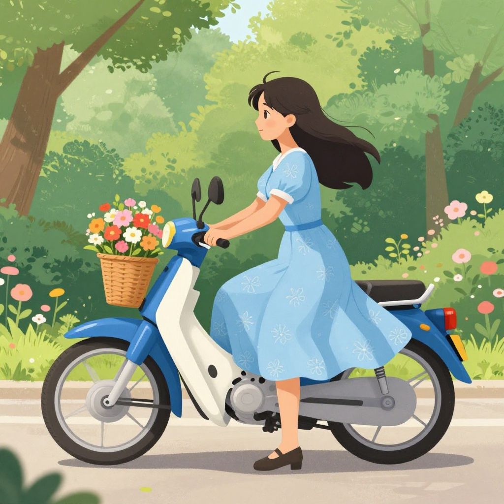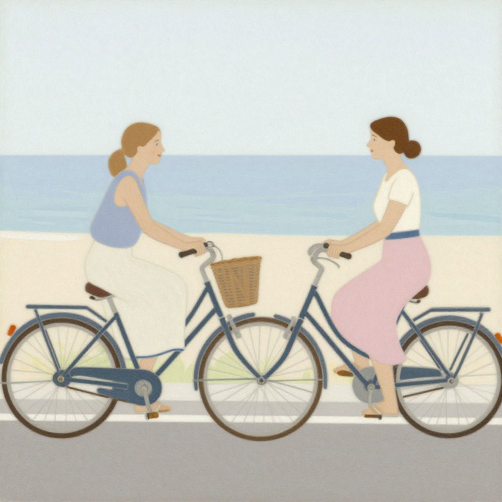 Reflective two women, two bicycles, summertime, smiling, soft pastel colours, modern clothes,ocean in background, image made of simple lines, simplicity, John Singer Sargent,