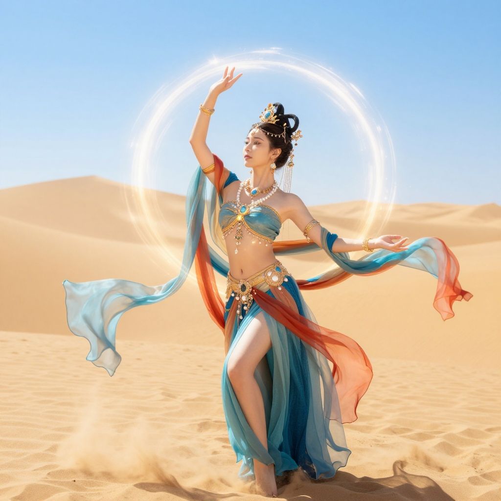 Belly dancer fantasy art depicting a mythical desert princess with vibrant silks and luminous jewelry, performing a spellbinding dance with swirling sand and ethereal light beams.