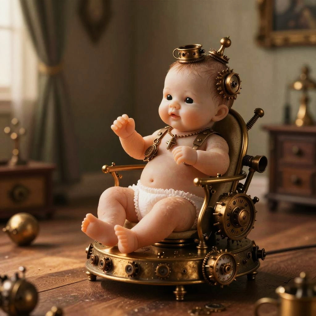 Photograph of a realistic baby doll with blue eyes, wearing a white diaper, sitting on a steampunk-style chair with brass gears, in a