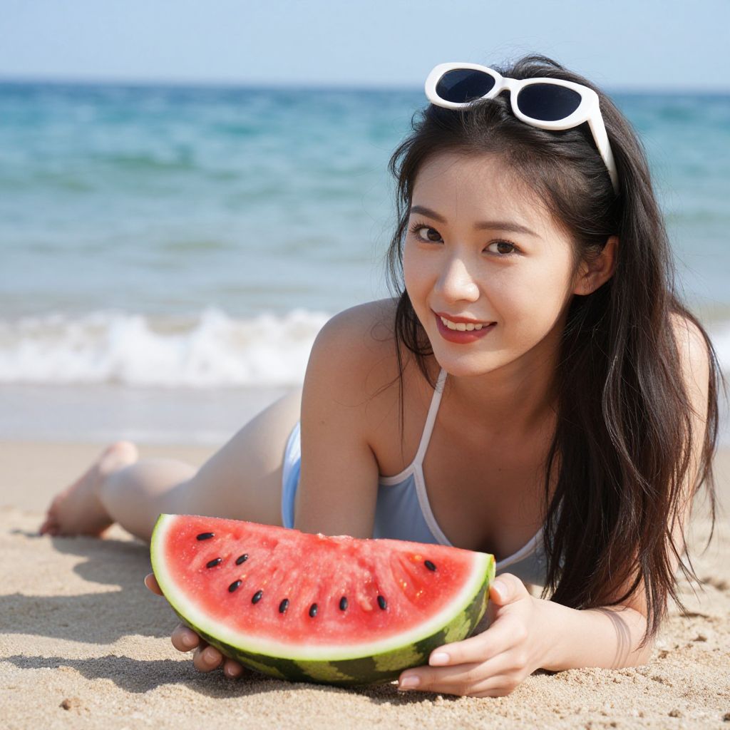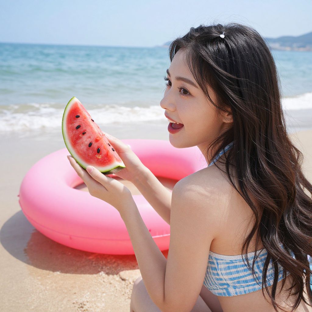 Young Woman with Watermelon Float on Beach