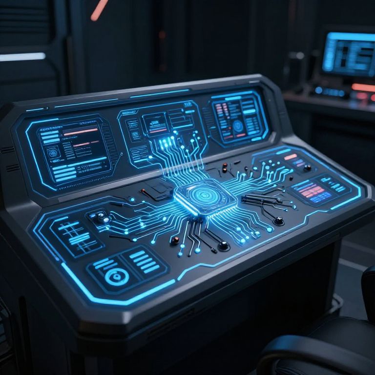 Photograph of a high-tech control panel with glowing blue neon circuit diagrams, buttons, and screens, set in a dimly-lit, futuristic environment