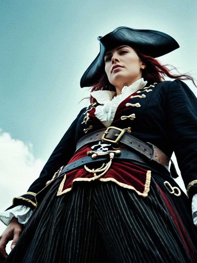 Woman in Pirate costume, cinematic realism, dramatic low-angle photo